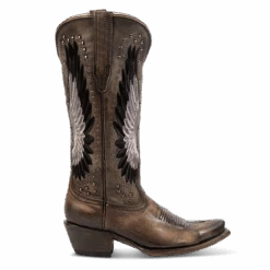 Spread your wings in our favorite western inspired silhouette, introducing ANGEL. Built with a traditional snip toe construction, this boot is paired with symmetrical leather pull straps and a low slant heel. Finished with spirited details that include ombre-stitch wings and embellished studs.