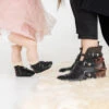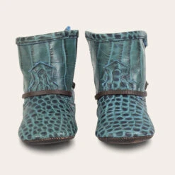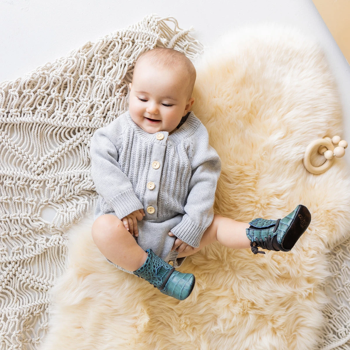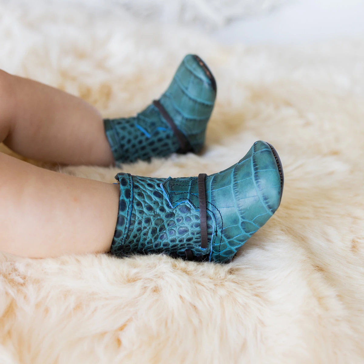 Our most loved tall boot just got better (and smaller). Detailed with a lace-up backing and a simple velcro fastening, this leather bootie will give a playful look to any outfit. Let your mini shine in the BABY COAL. Designed with 100% full-grain croco embossed leather.