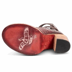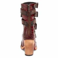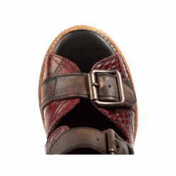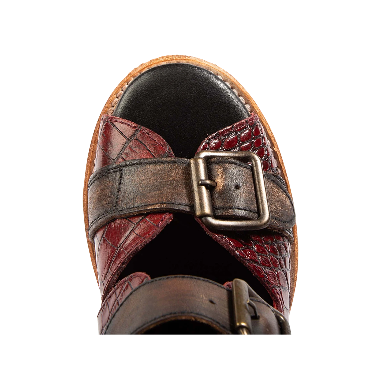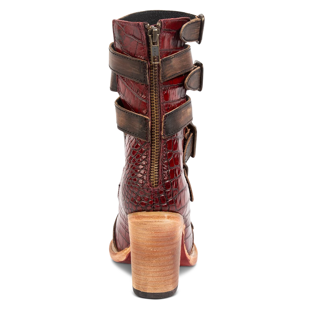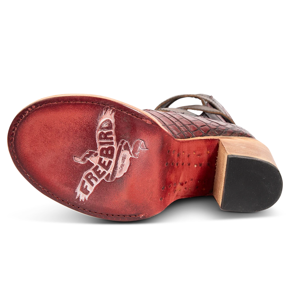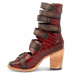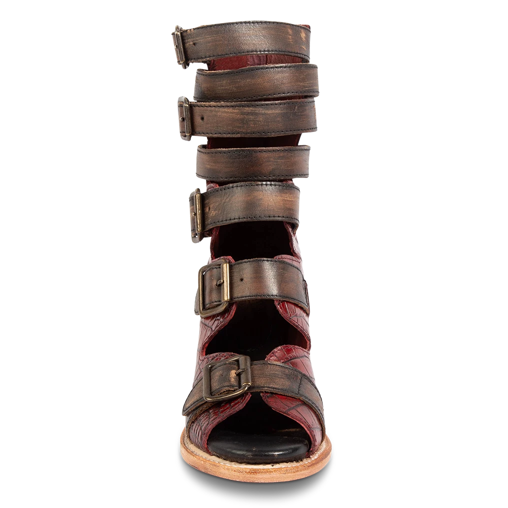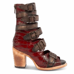 The name’s BOND. Hitting just below the calf, this open-toed sandal is crafted with an exposed silhouette and designed with 5 adjustable straps and brass buckles for a flexible fit. Finished with a raised block heel and working brass zip closure. Constructed with 100% full-grain croco embossed leather.