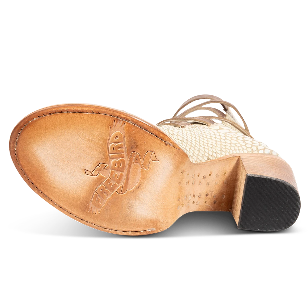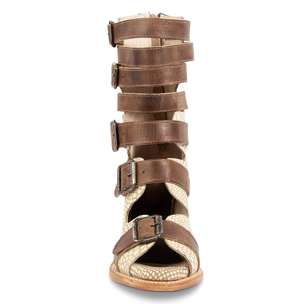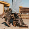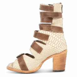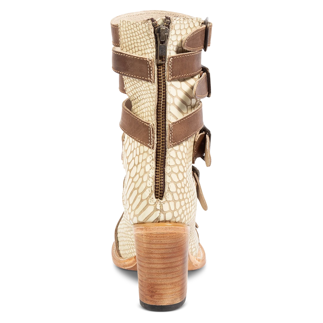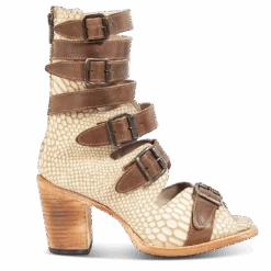 The name’s BOND. Hitting just below the calf, this open-toed sandal is crafted with an exposed silhouette and designed with 5 adjustable straps and brass buckles for a flexible fit. Finished with a raised block heel and working brass zip closure.
