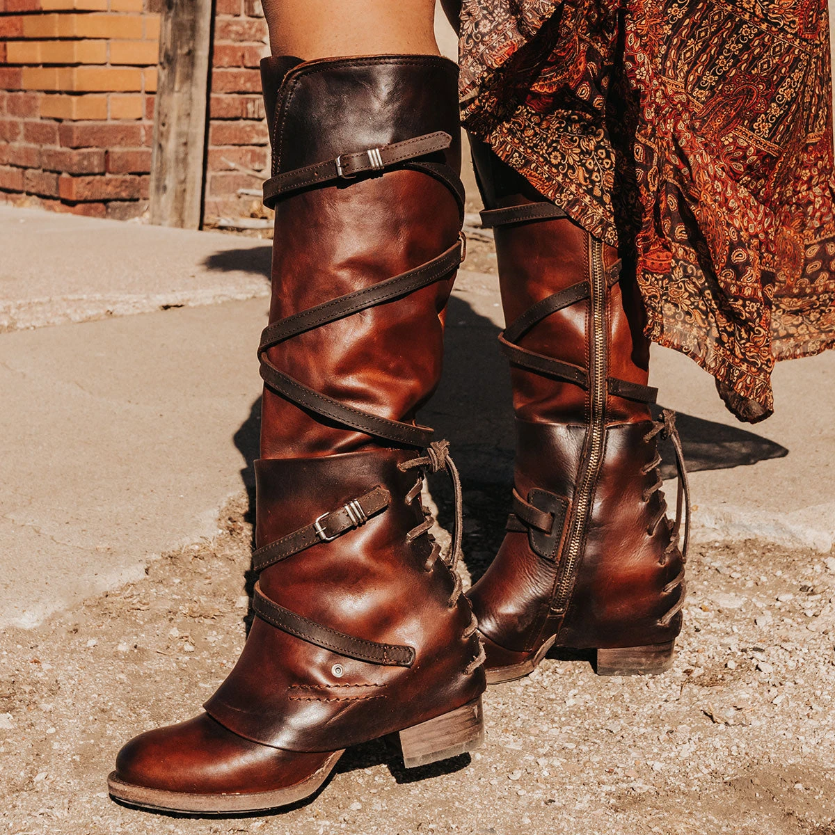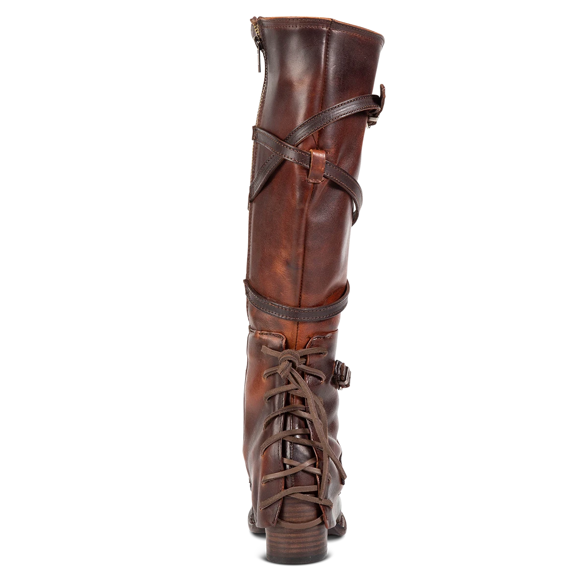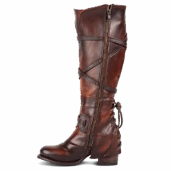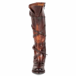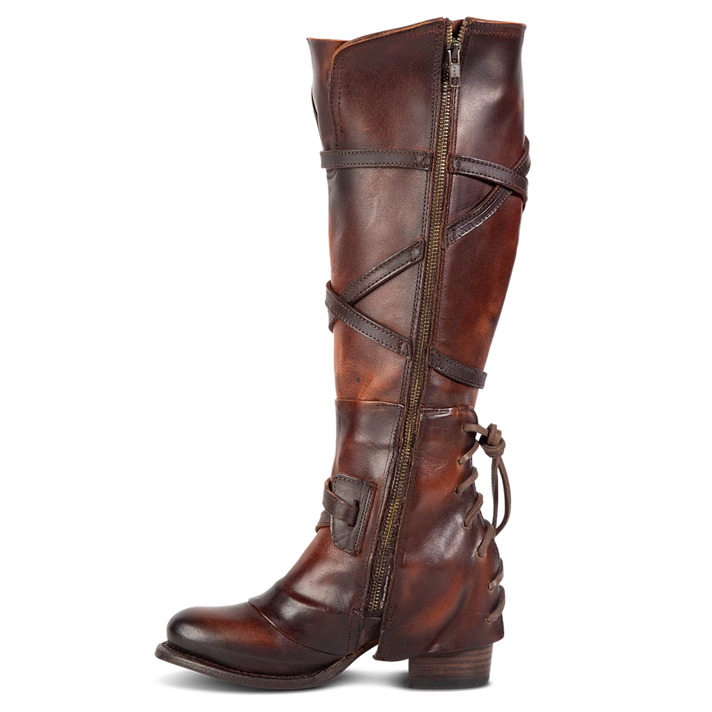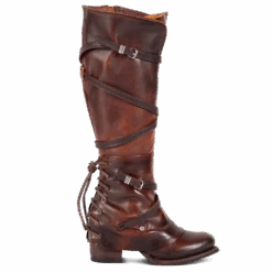 Meet CASSIUS, an eye-catching addition to your collection. Its unique back-lacing ankle overlay is complemented by stunning leather straps and silver buckles that wrap its tall shaft. A full inside brass zip closure allows for effortless wear.