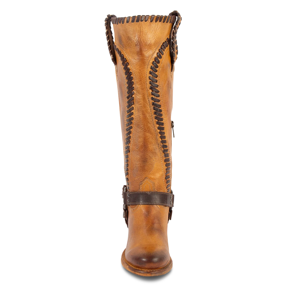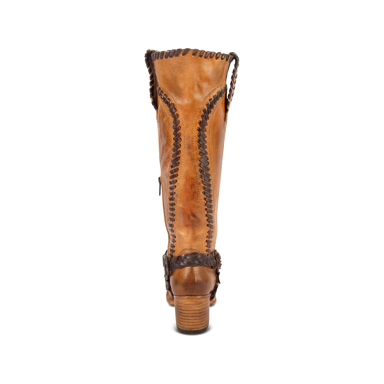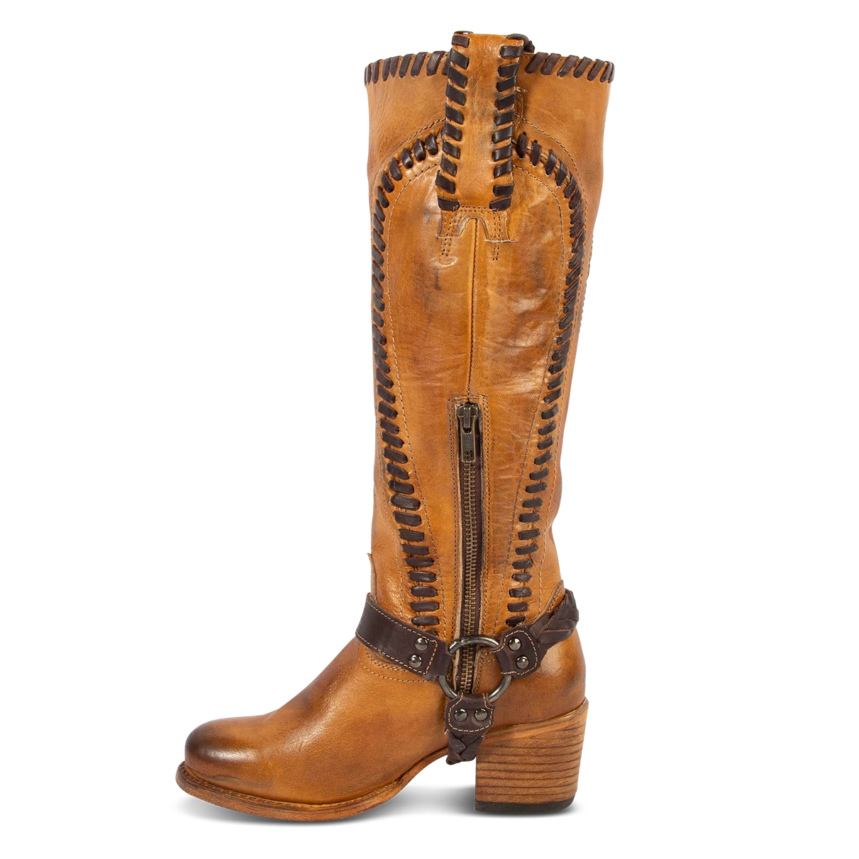 Constructed with intricate whip stitch detailing, CLOVER is paired with a tall shaft and working inside half zip closure. Completed with a round toe, leather pull straps, and braided ankle harness.