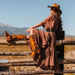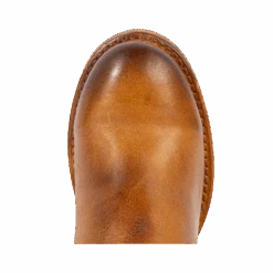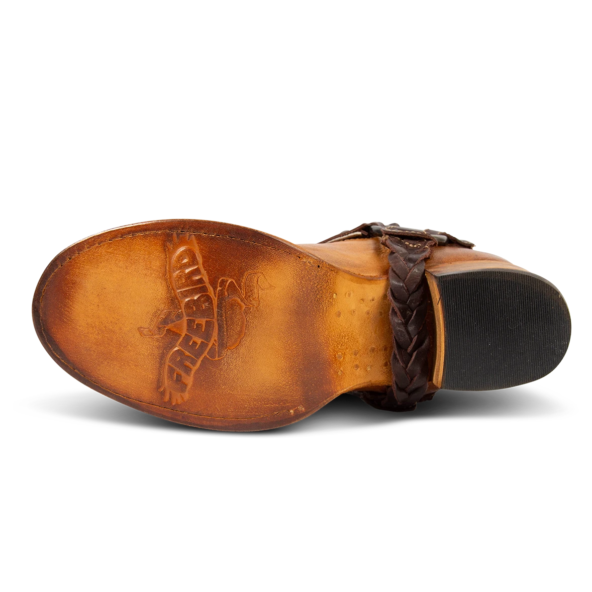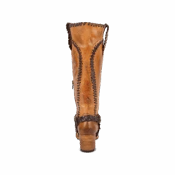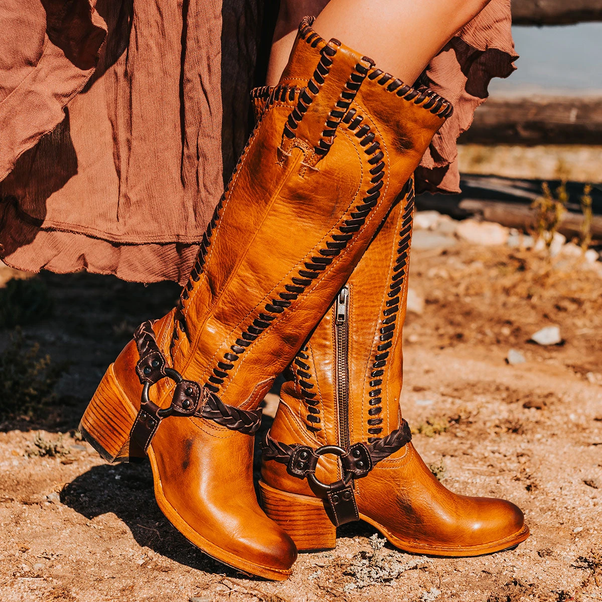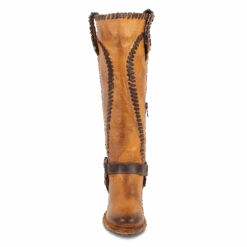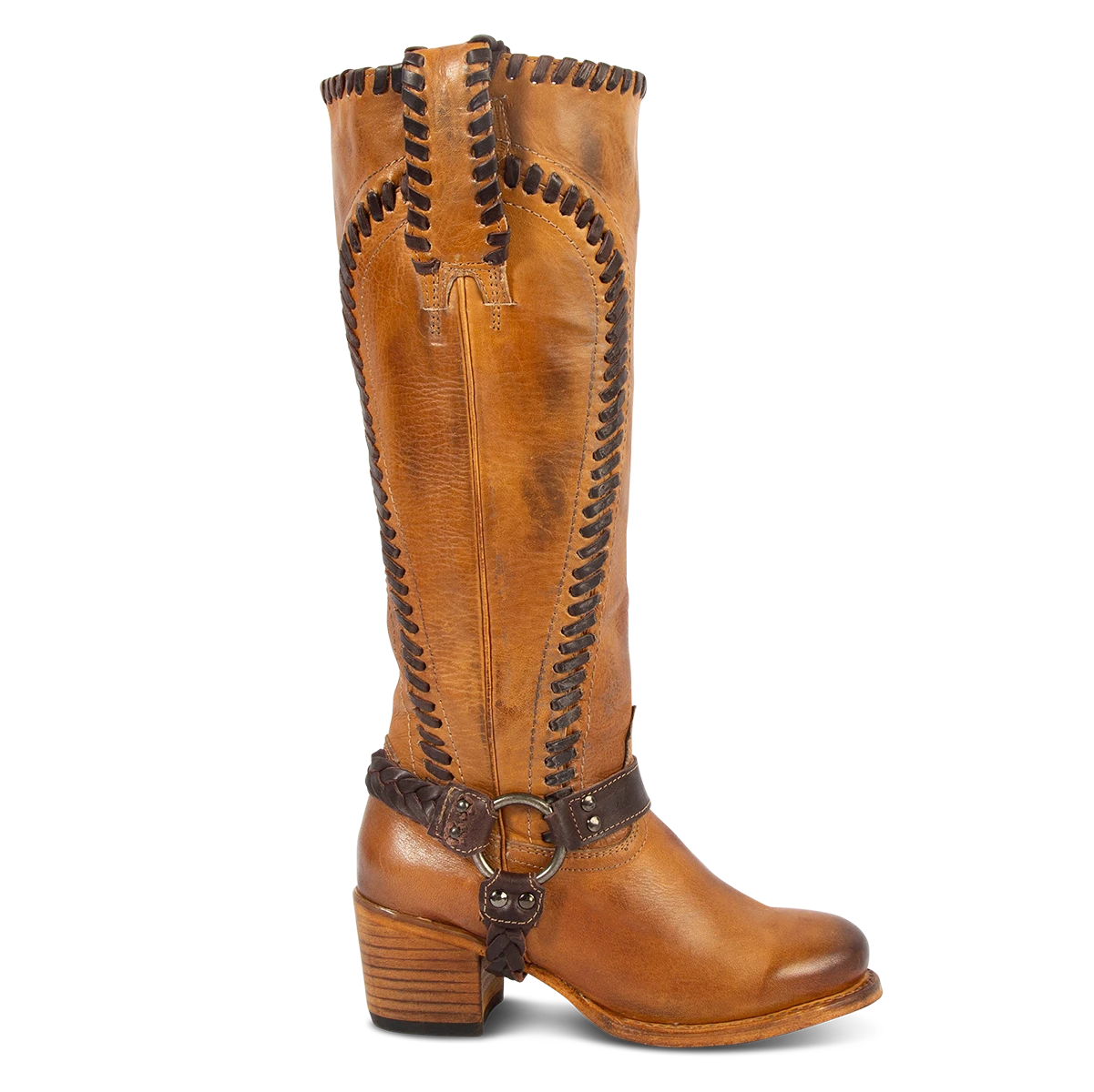 Constructed with intricate whip stitch detailing, CLOVER is paired with a tall shaft and working inside half zip closure. Completed with a round toe, leather pull straps, and braided ankle harness.