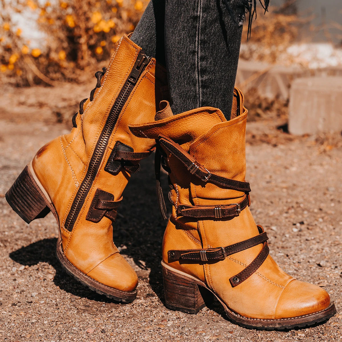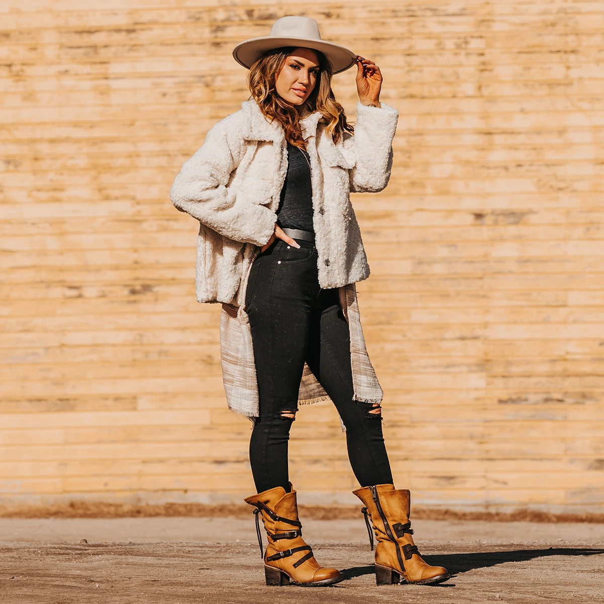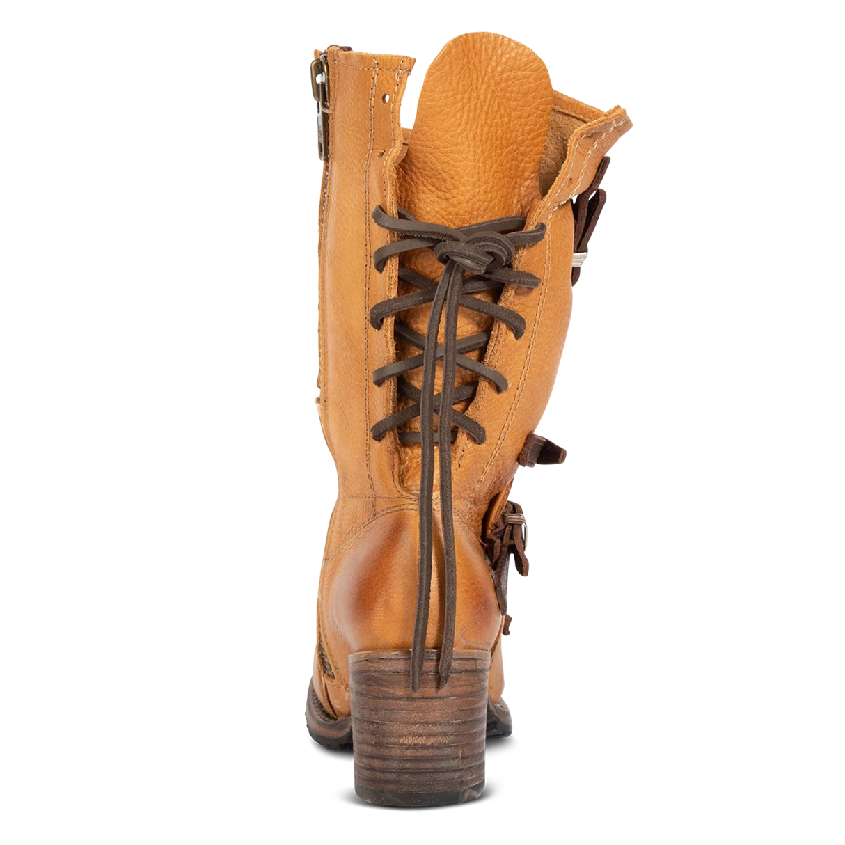 Imagine looking good from all angles. Designed with a slouchy silhouette, CORA is fun, yet functional with its inside brass zip closure and rubber tread sole. Its overlapped shaft features leather straps with adjustable silver buckles and a back-lacing design. Comfortable and unique, you won’t go anywhere without your CORA.