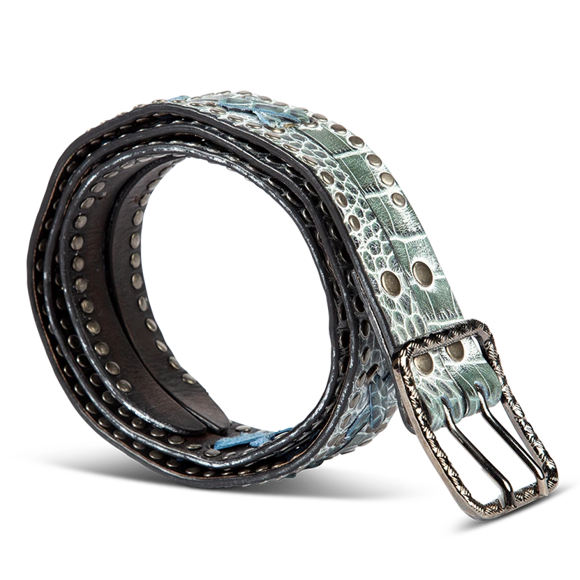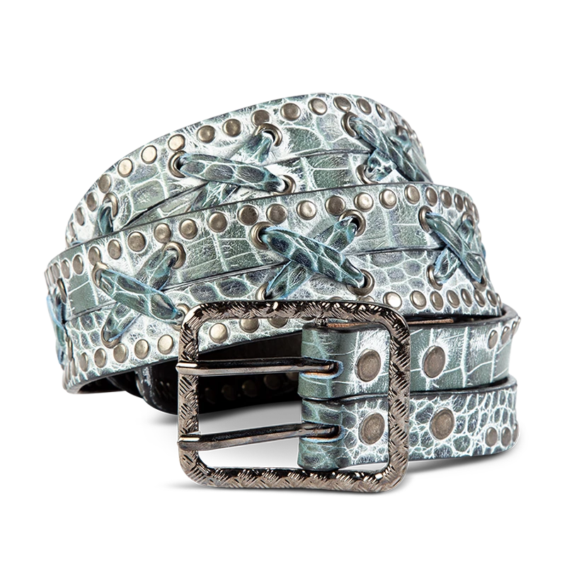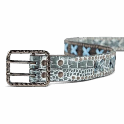 This belt is unmatched with its stud detailing and criss-crossing leather construction. Paired perfectly with rustic hardware and finished with a double-prong buckle. Handcrafted in Mexico with 100% full-grain leather. Designed with 100% full-grain croco embossed leather.