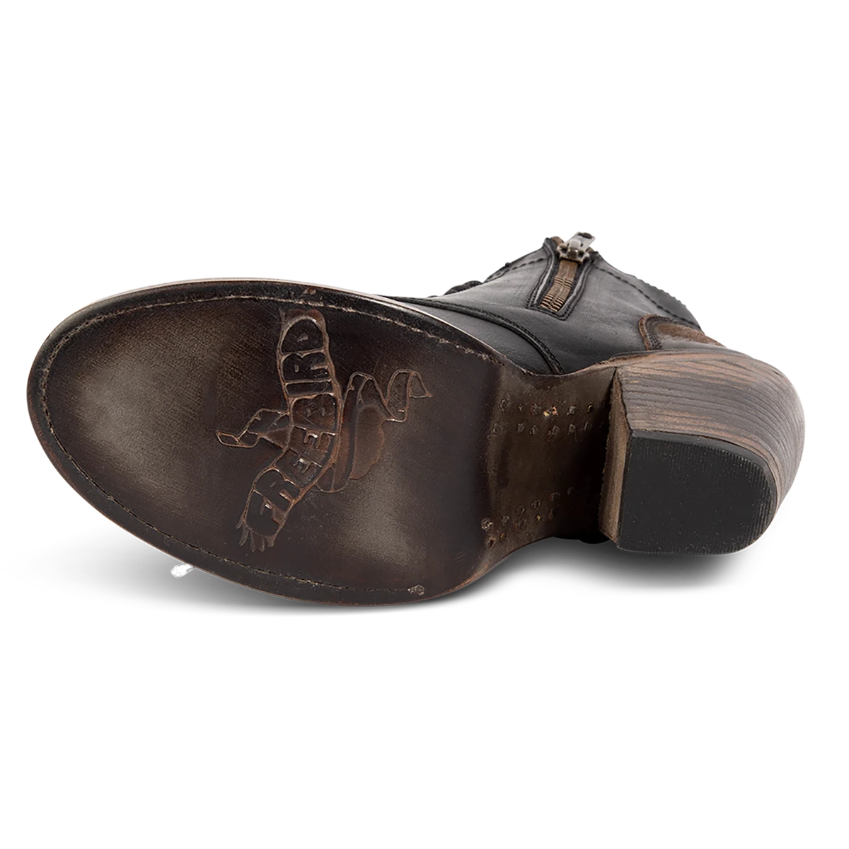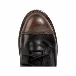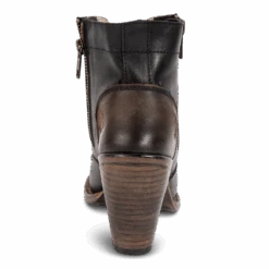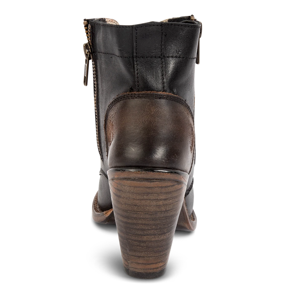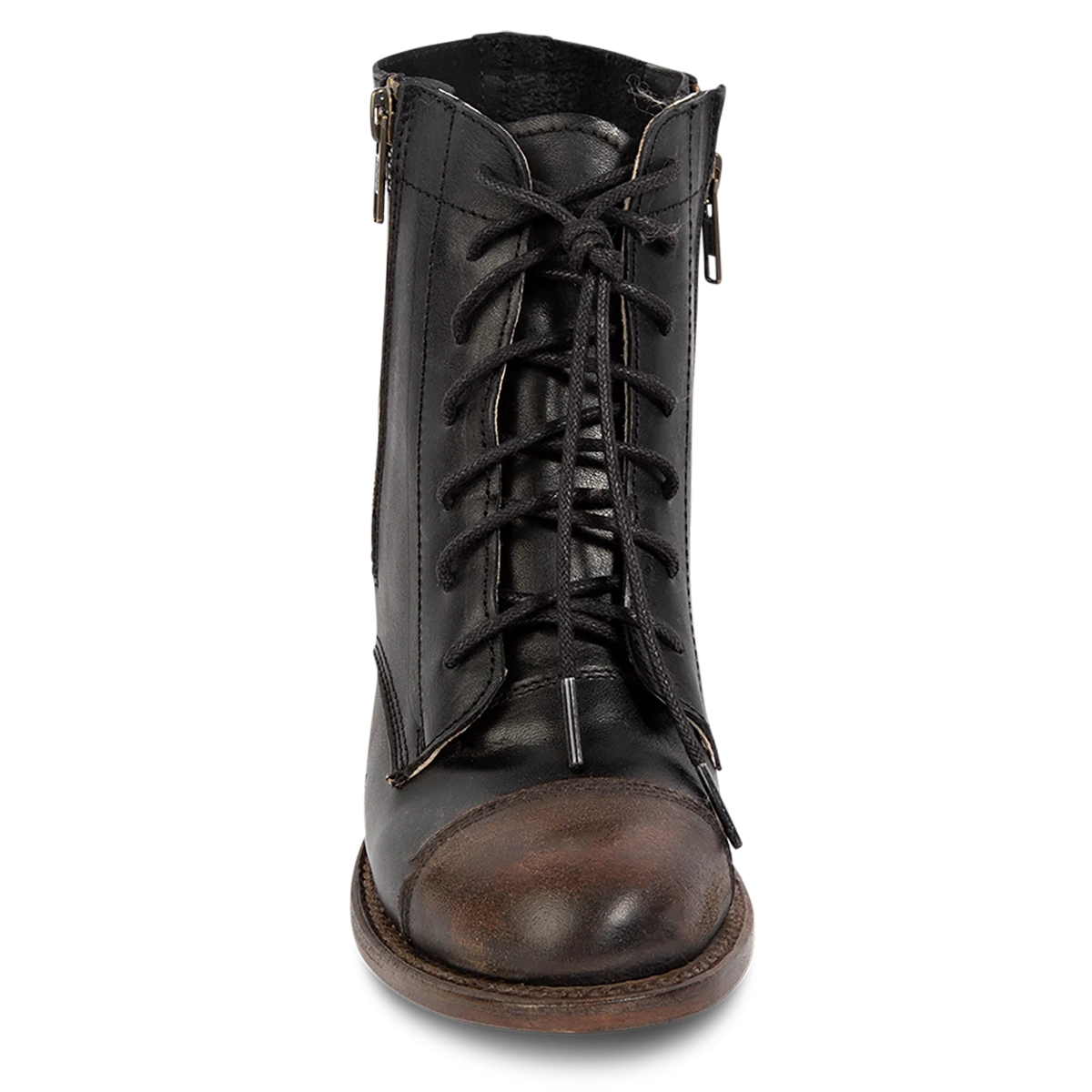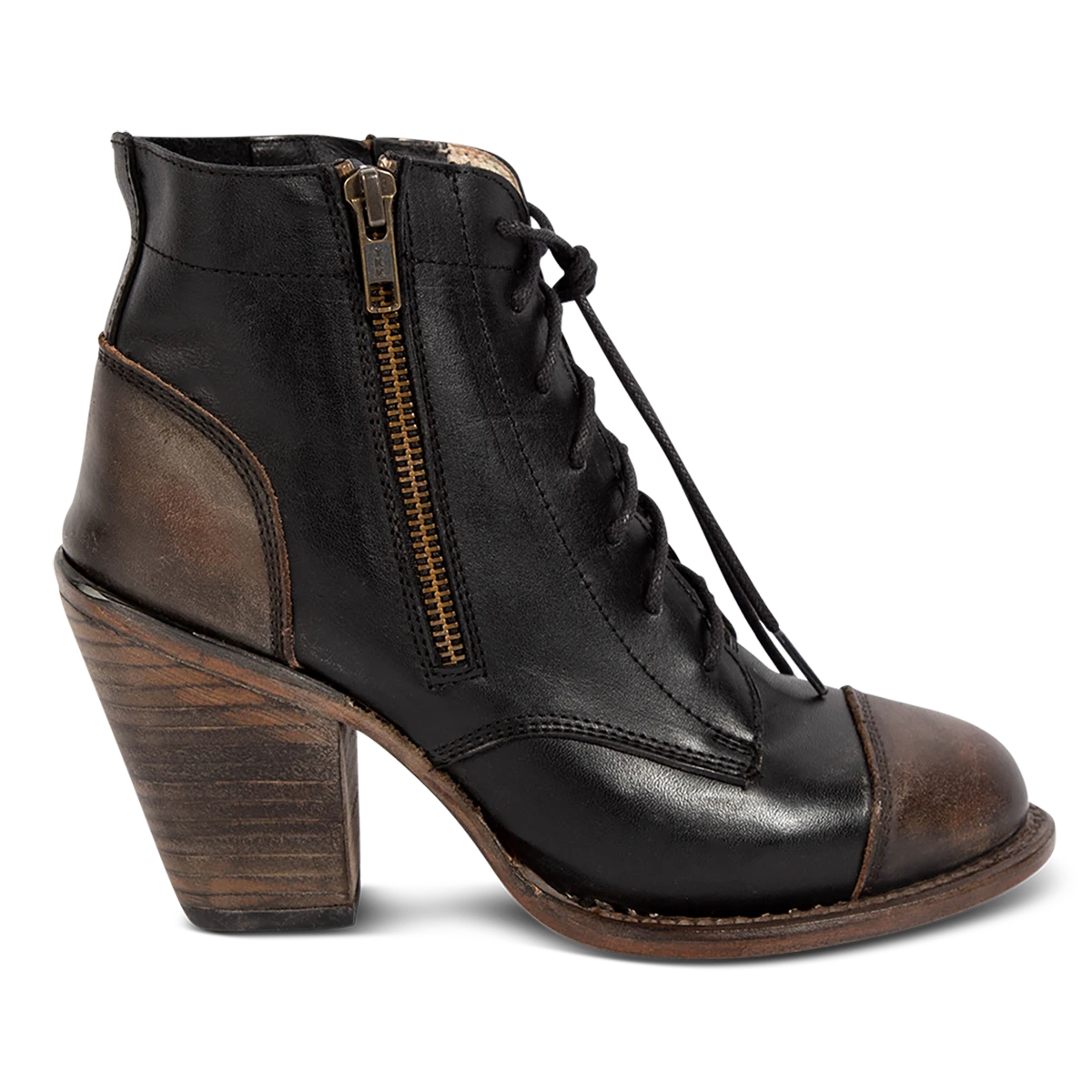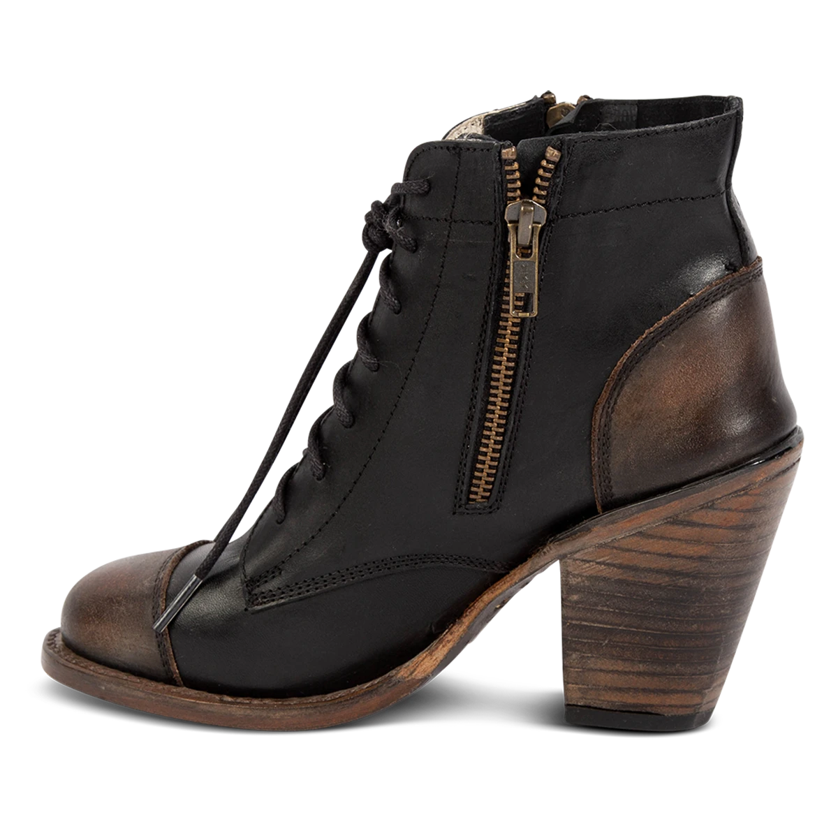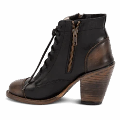 DAME combines a classic bootie silhouette with modern charm and personality. Constructed with 100% full grain leather and built on an inverted stacked heel, this bootie is ready to take you from day to night. Featuring an inside working zipper with front tie lacing for ease of wear and comfort.Â