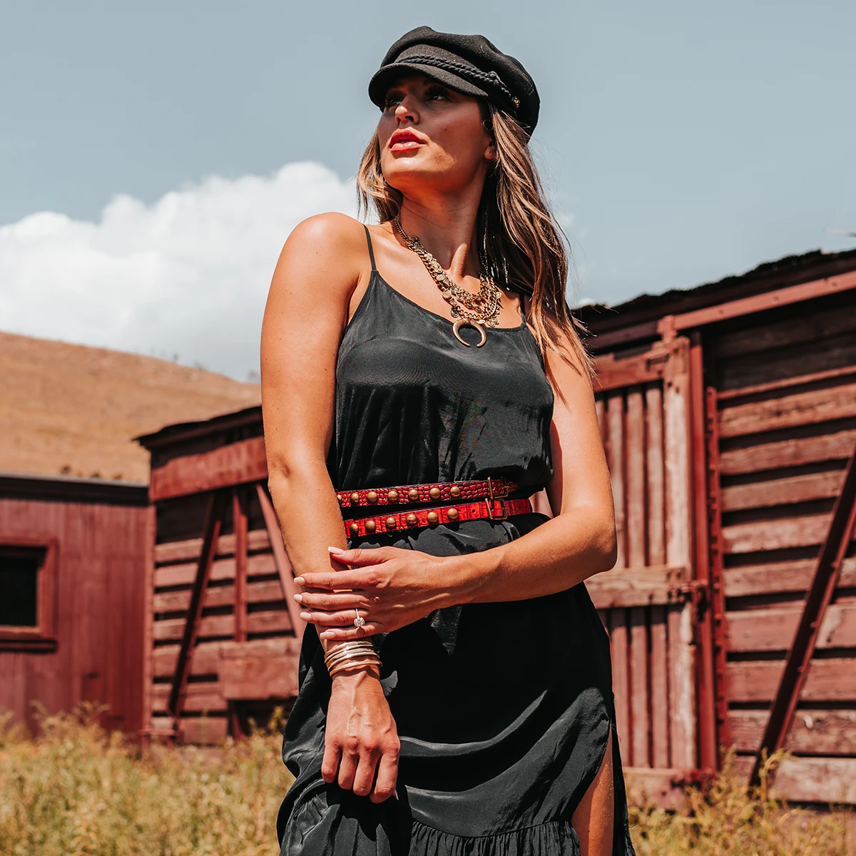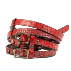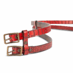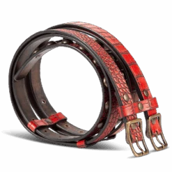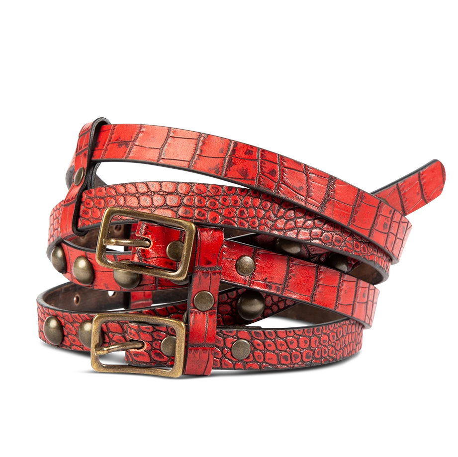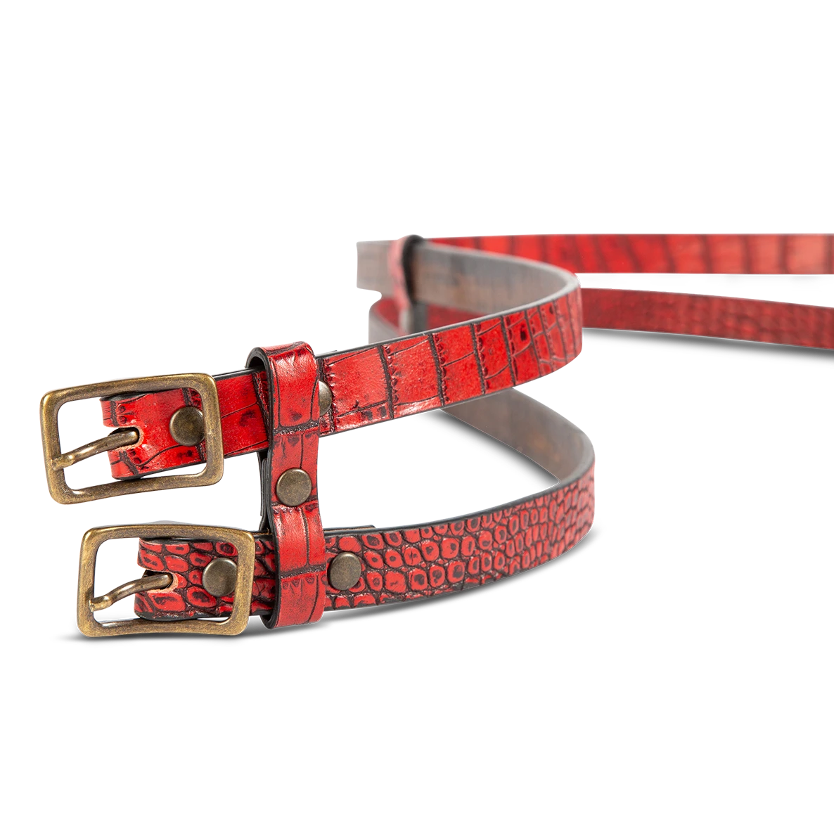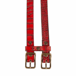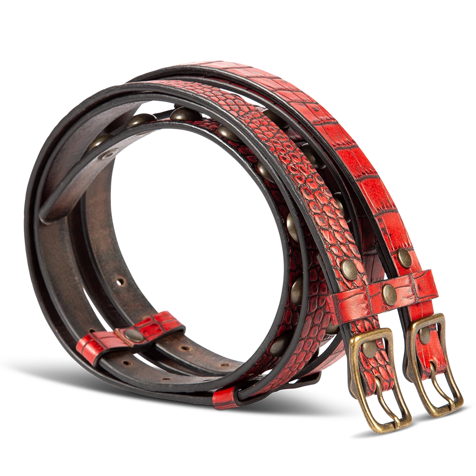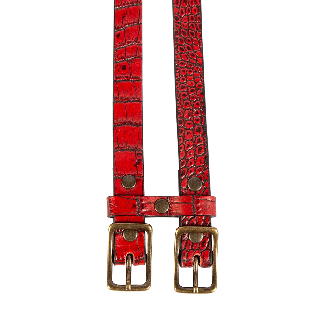 So good we had to double it. This waist belt features a unique double strap that is decorated with brass studs. Completed with two single-prong brass buckles that create a customizable fit to your waist. Handcrafted in Mexico with 100% full-grain croco embossed leather.