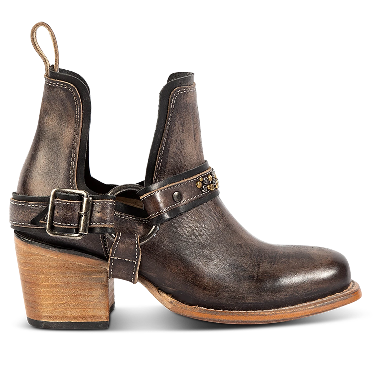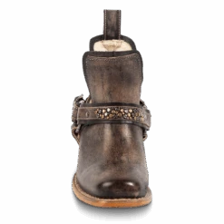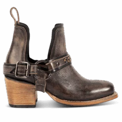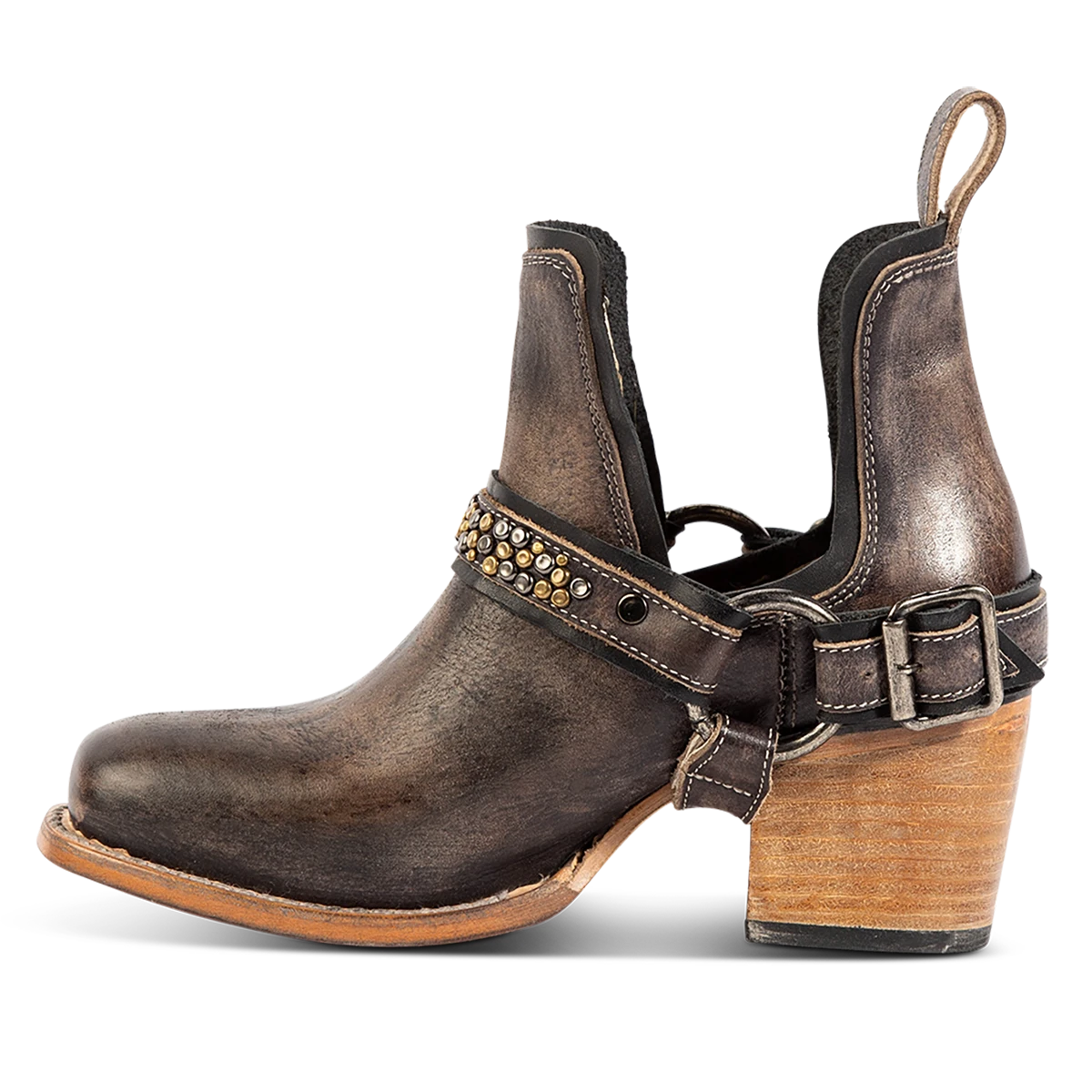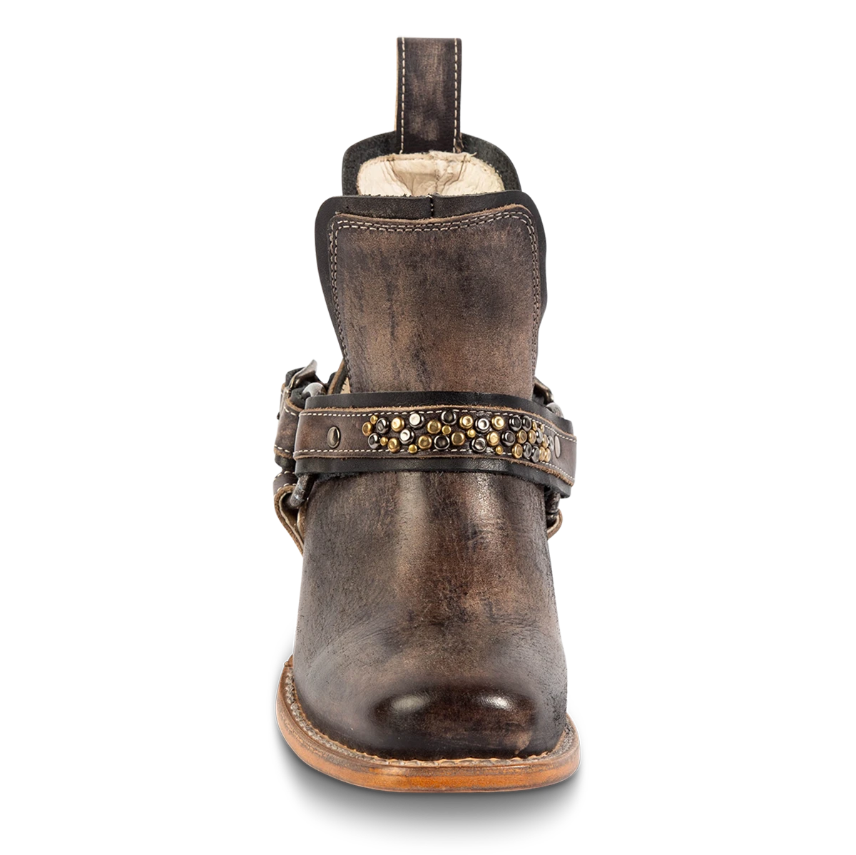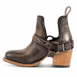 Inspired by concrete cowgirls with a Western attitude – DUSTY. Designed with 100% full grain soft leather and a removable harness with dimensional studded embellishments. Completed with top-line detailing that features a stacked heel, square toe construction and leather pull tabs for an effortlessly secure slip on bootie.Â