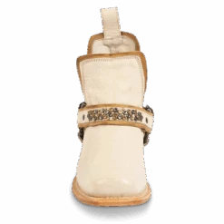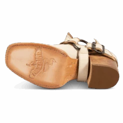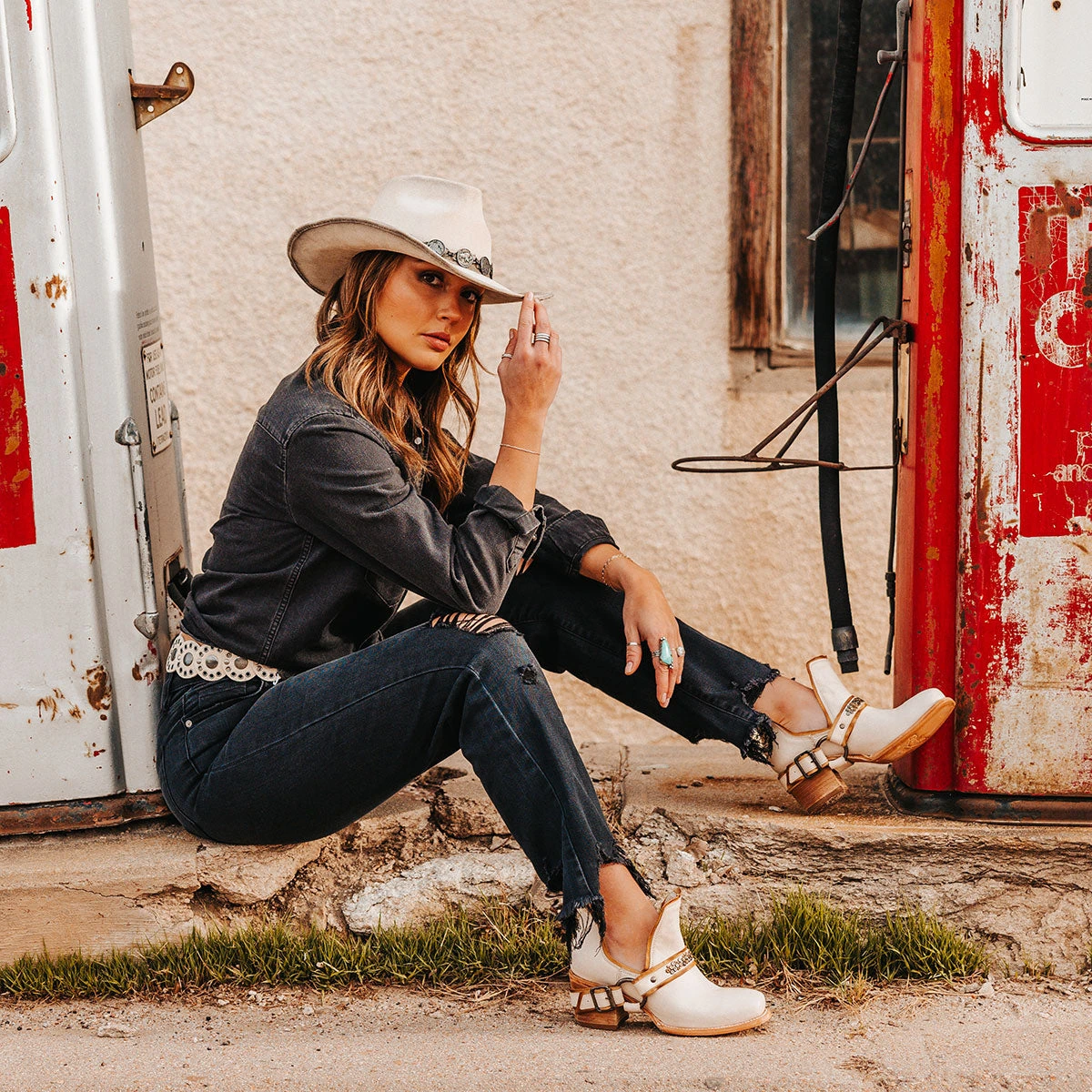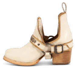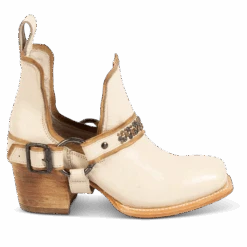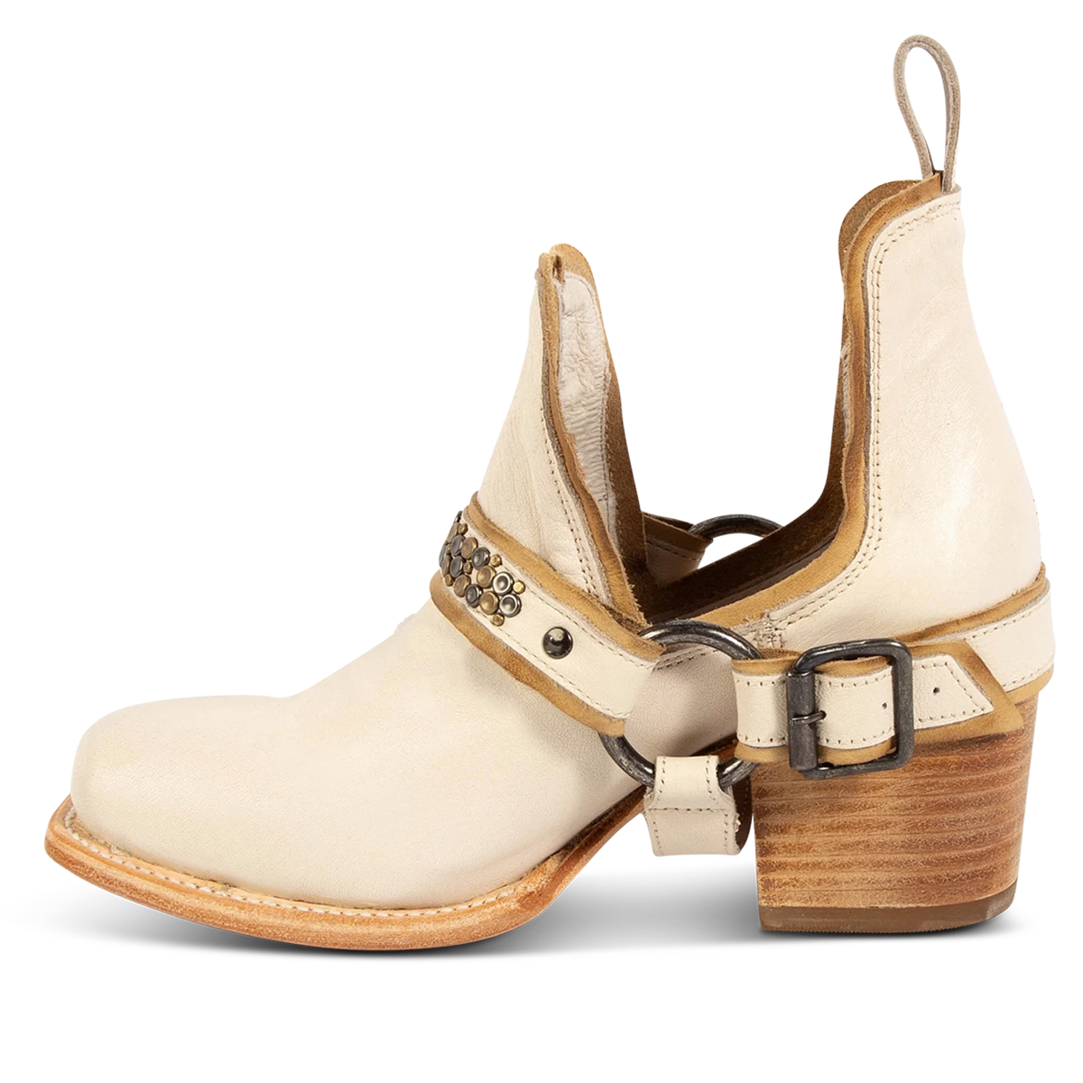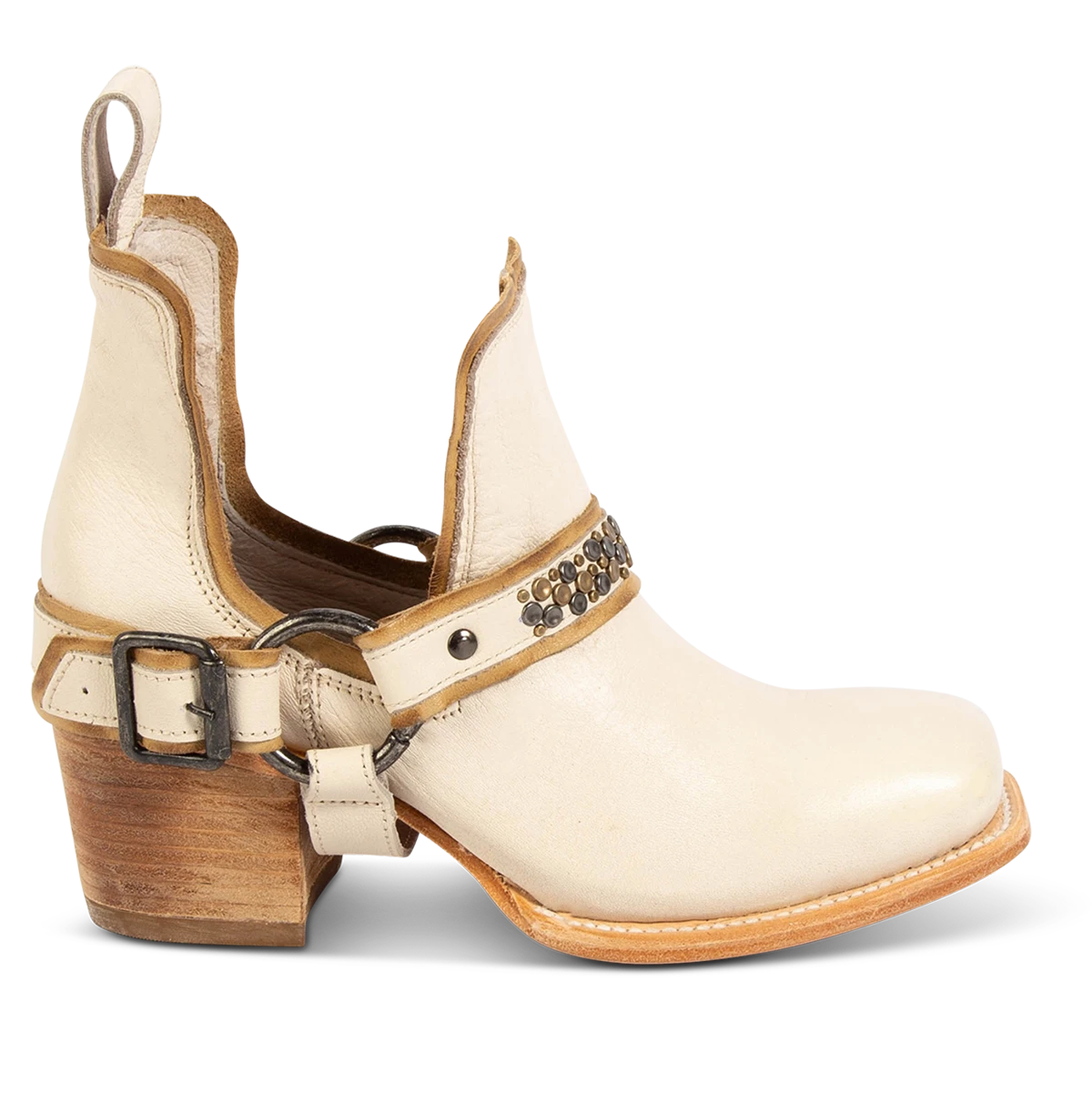 Inspired by concrete cowgirls with a Western attitude – DUSTY. Designed with 100% full grain soft leather and a removable harness with dimensional studded embellishments. Completed with top-line detailing that features a stacked heel, square toe construction and leather pull tabs for an effortlessly secure slip on bootie.