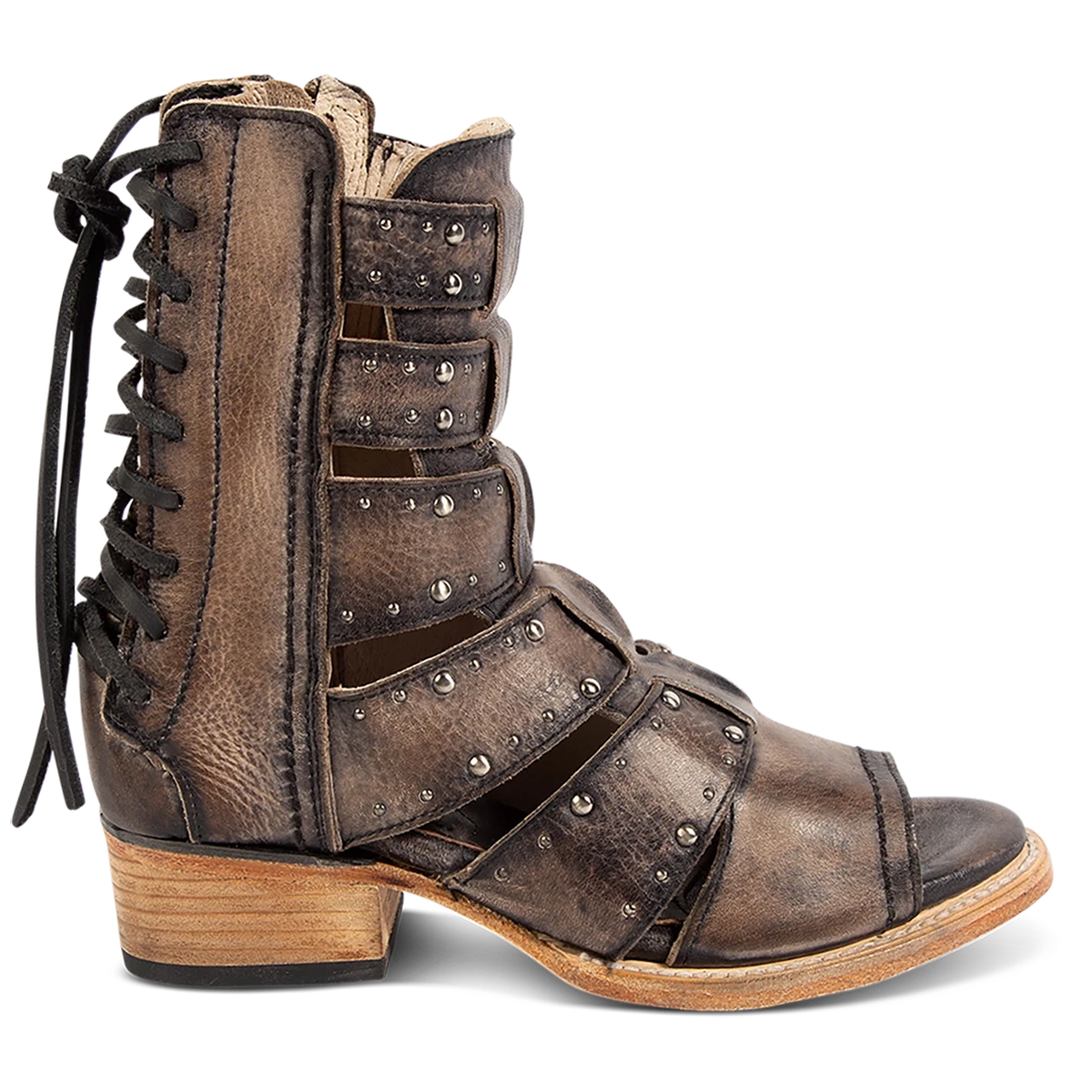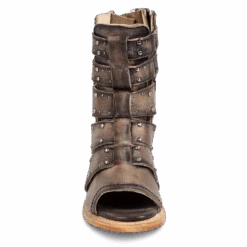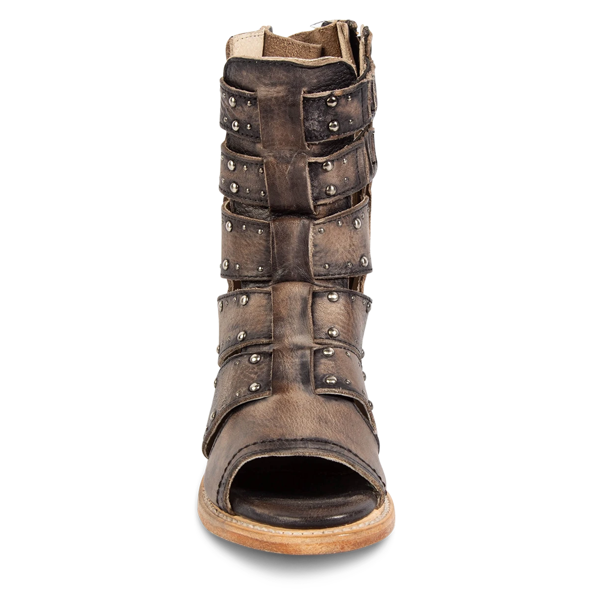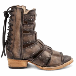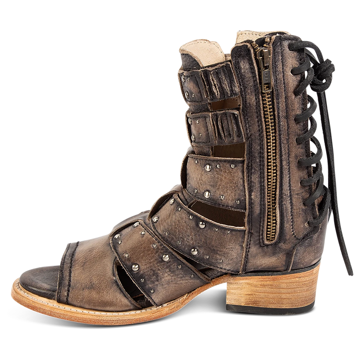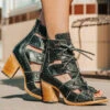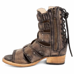 Our summer spirit is running high in GHOST. Handmade with 100% full grain leather, this low-heeled sandal is built with an exposed exterior and open toe construction, inside working zip closure and adjustable back panel lacing. Adorned with contrasting metal embellishments, these sandals are so good we’re spooked.Â