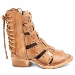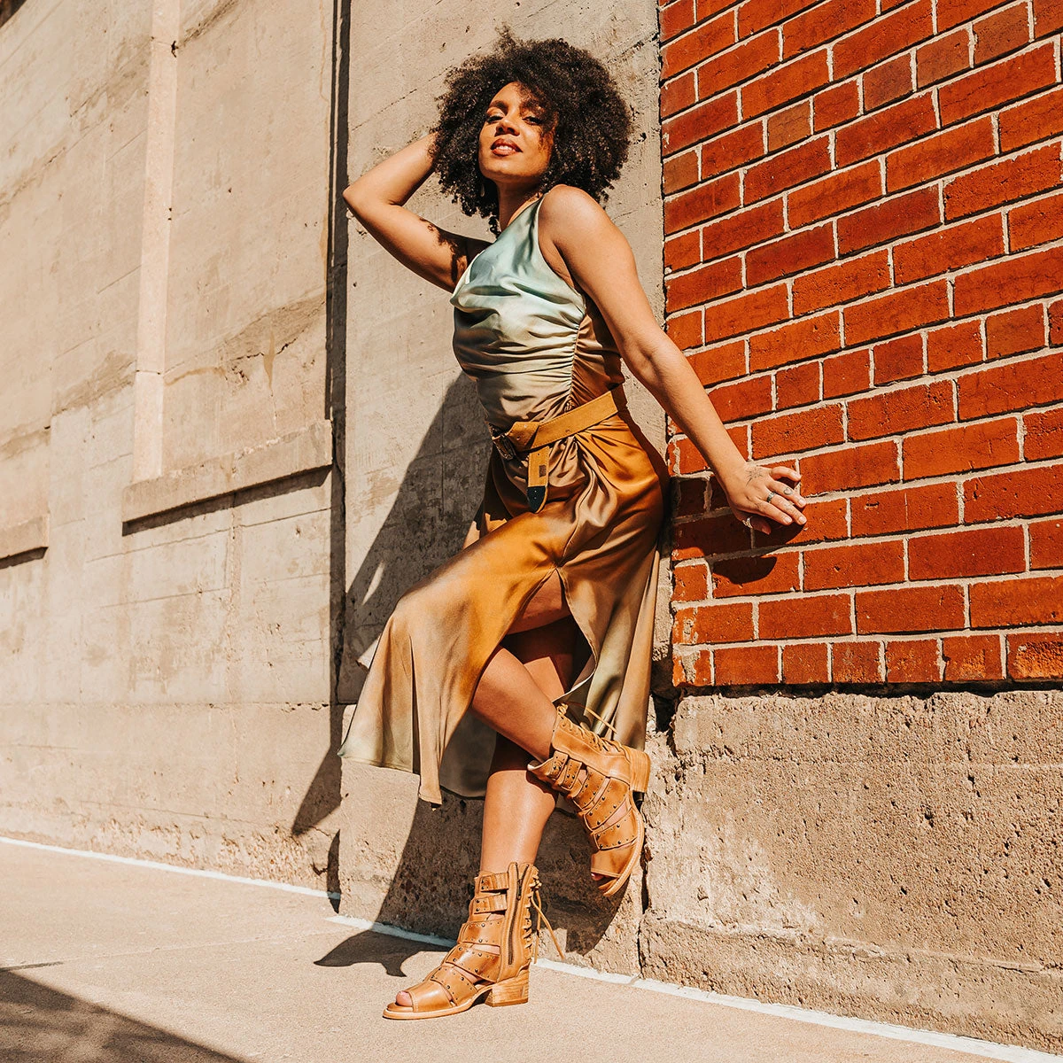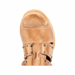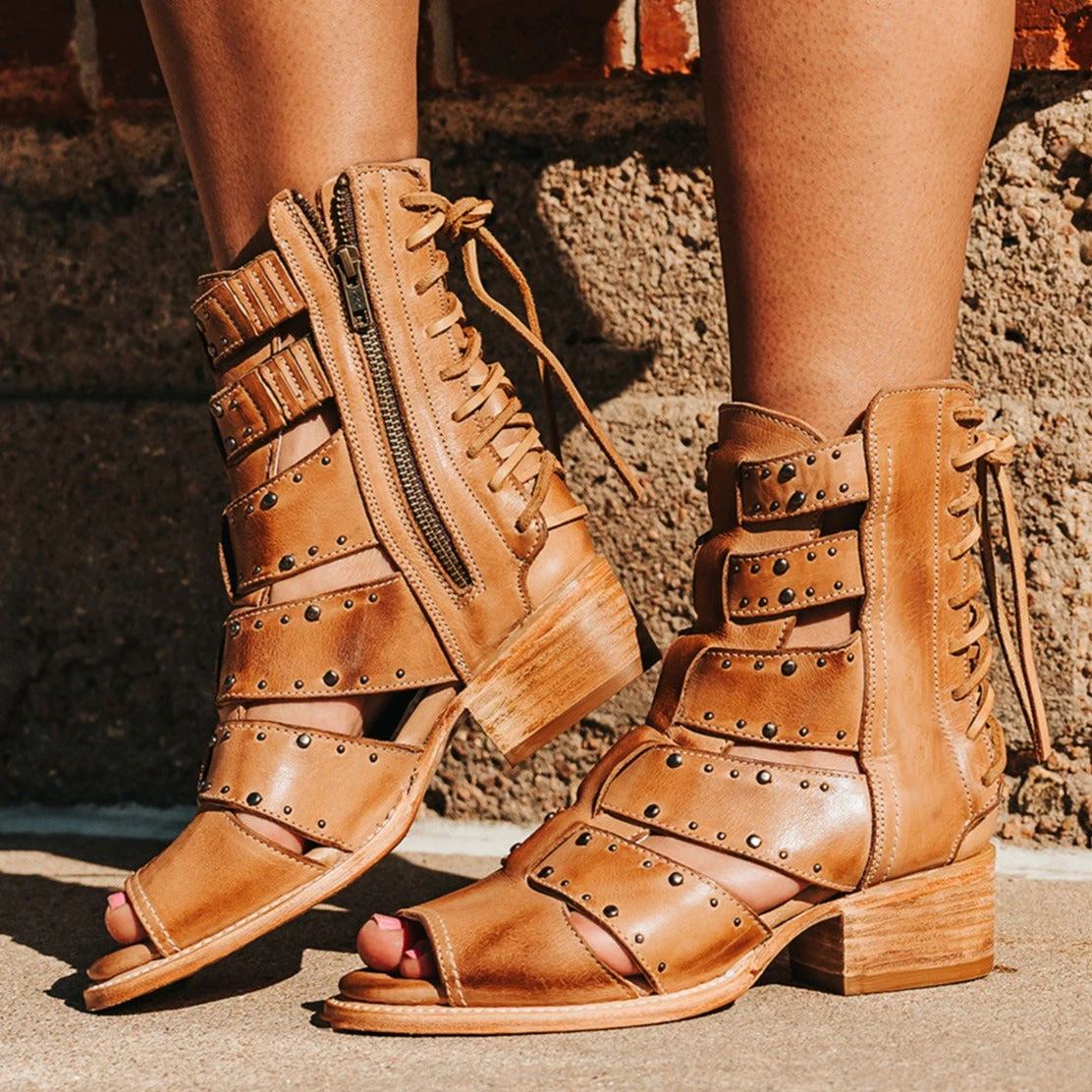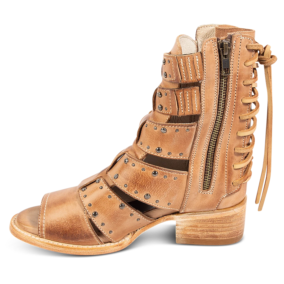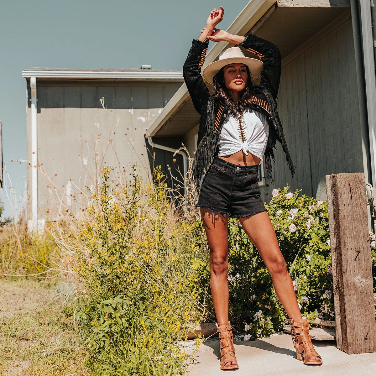 Our summer spirit is running high in GHOST. Handmade with 100% full grain leather, this low-heeled sandal is built with an exposed exterior and open toe construction, inside working zip closure and adjustable back panel lacing. Adorned with contrasting metal embellishments, these sandals are so good we’re spooked.Â