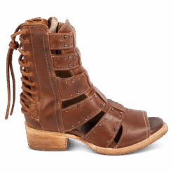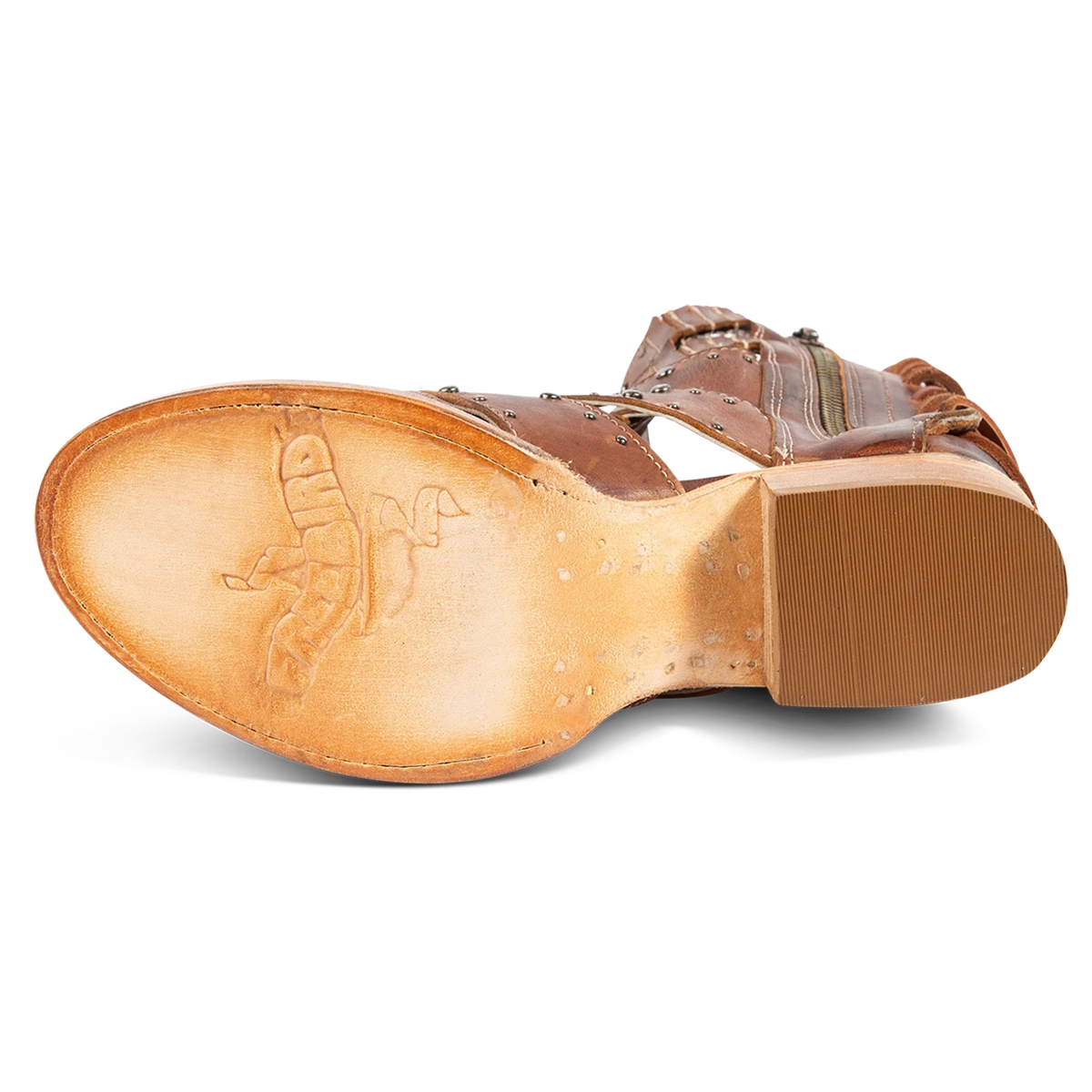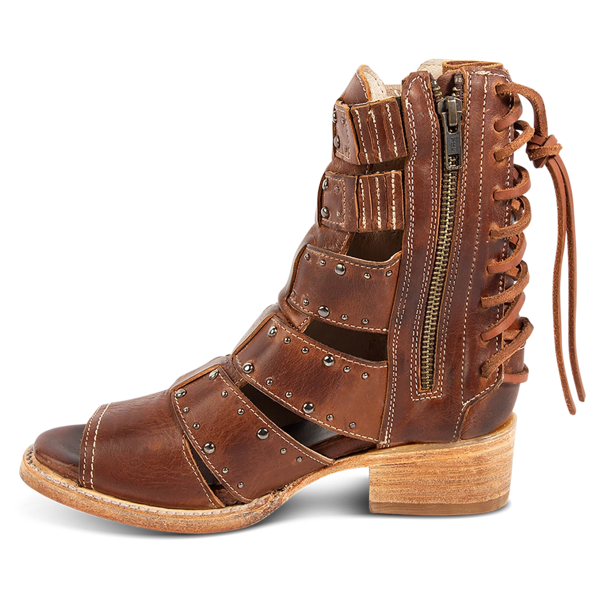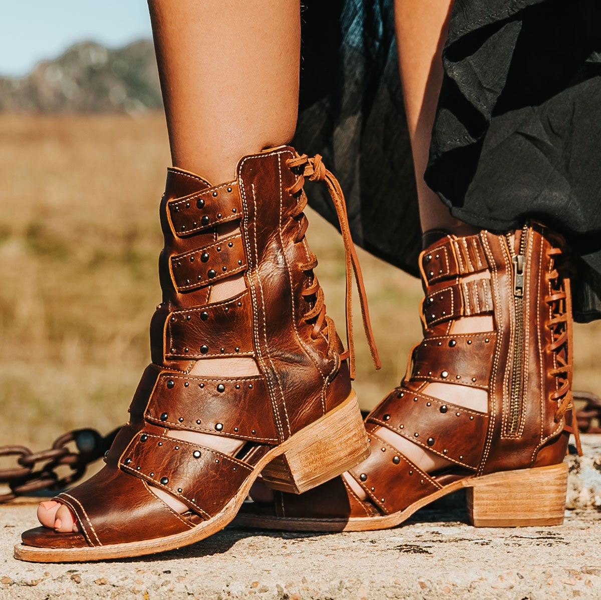 Our summer spirit is running high in GHOST. Handmade with 100% full grain leather, this low-heeled sandal is built with an exposed exterior and open toe construction, inside working zip closure and adjustable back panel lacing. Adorned with contrasting metal embellishments, these sandals are so good we’re spooked.Â