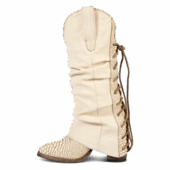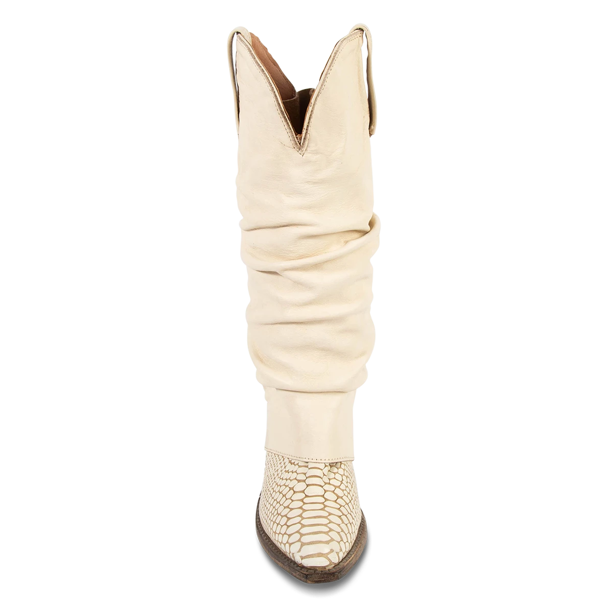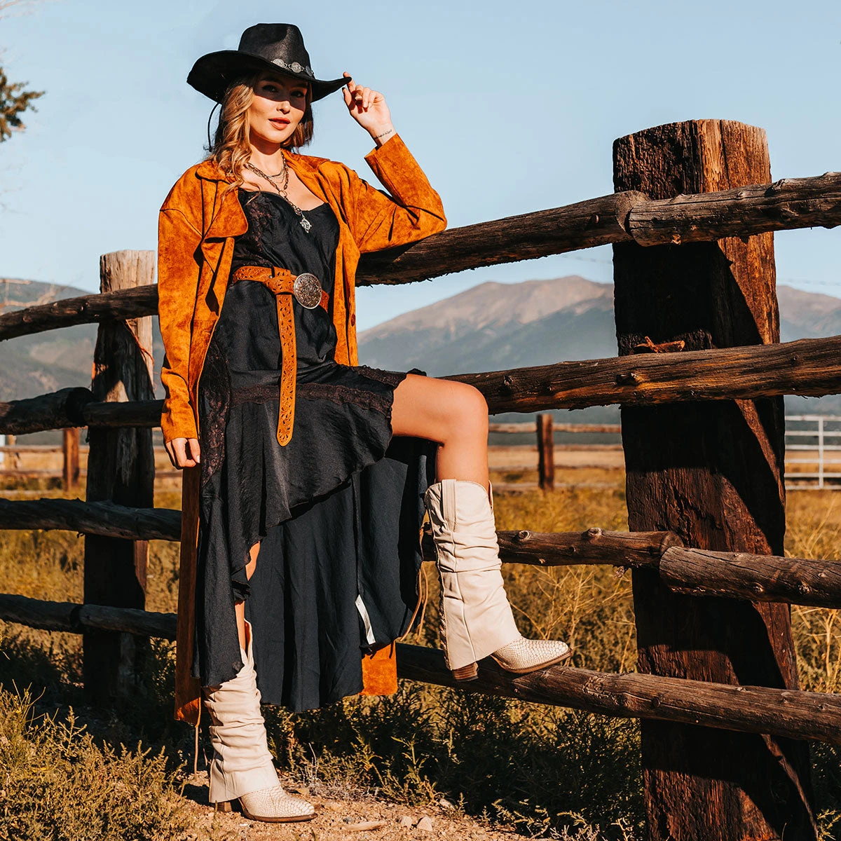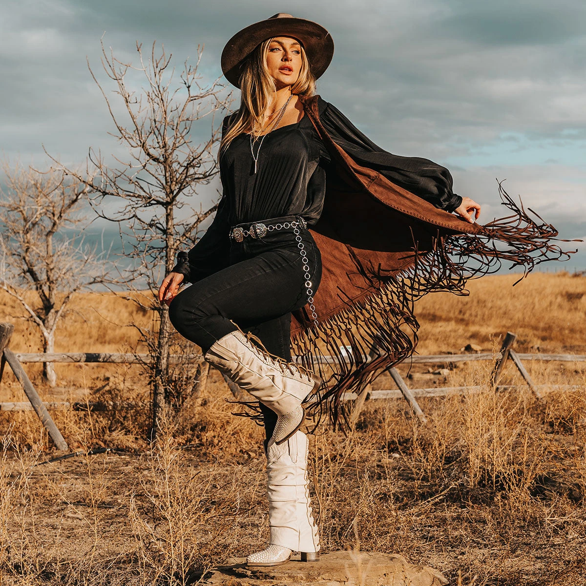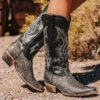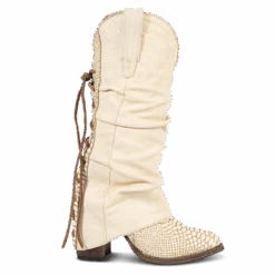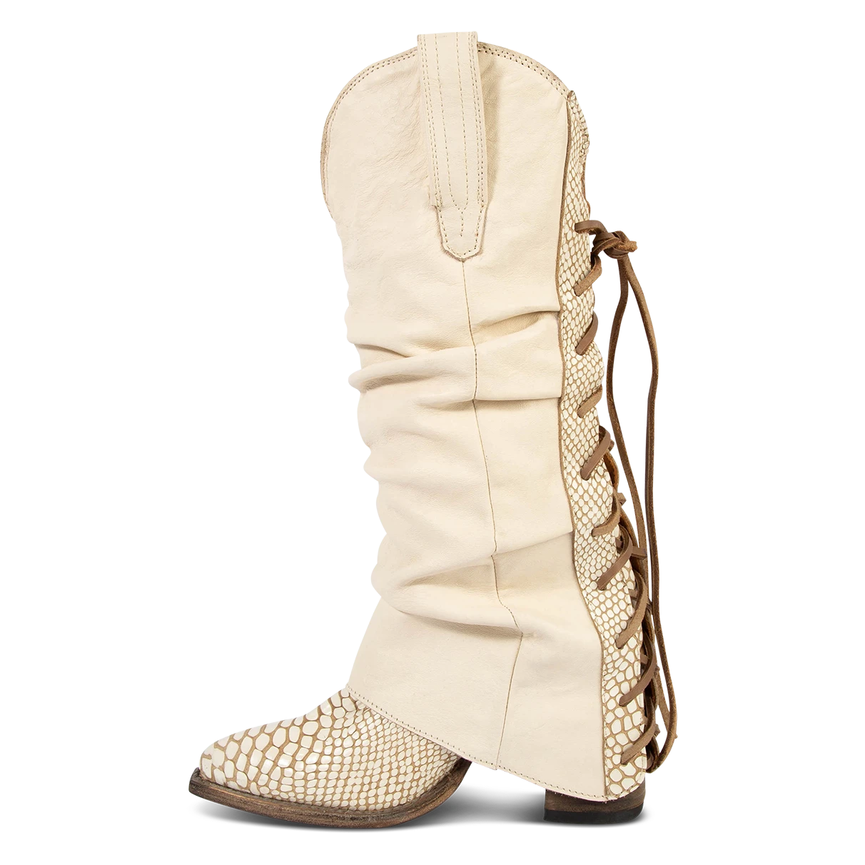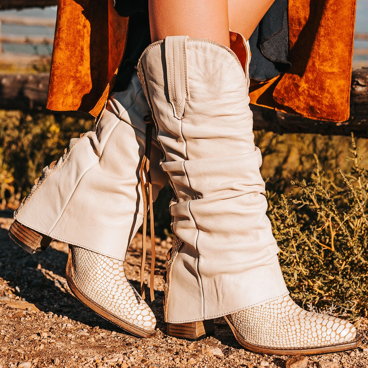 Designed with a decorative overlay, JULES is crafted with a relaxed silhouette and features an expandable contrasting back lace panel. This detailed tall boot showcases a pointed toe with traditional stitching and stands upon an elevated flare heel. Constructed with embossed leather.