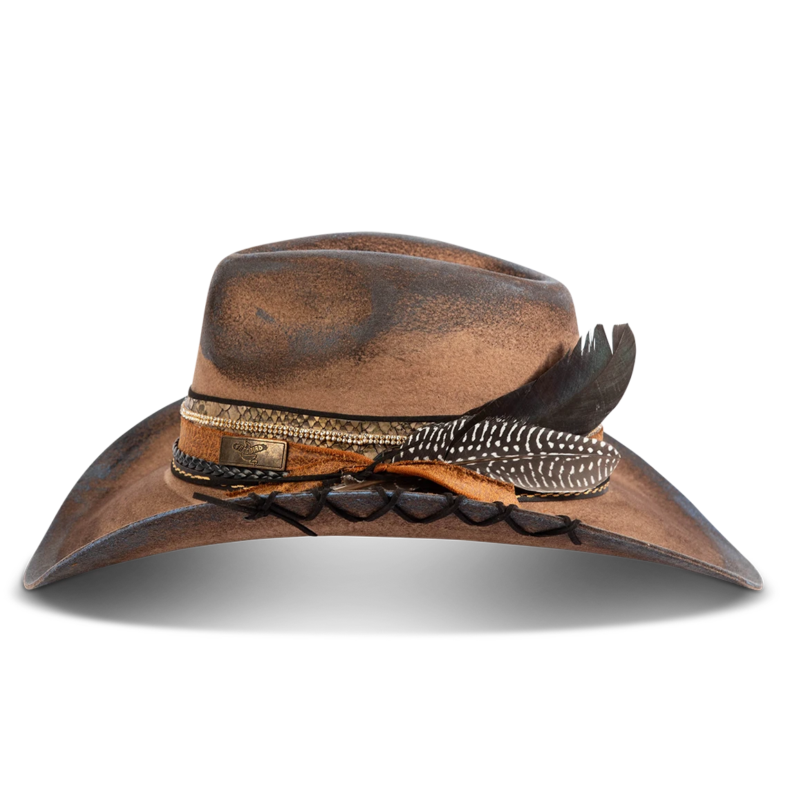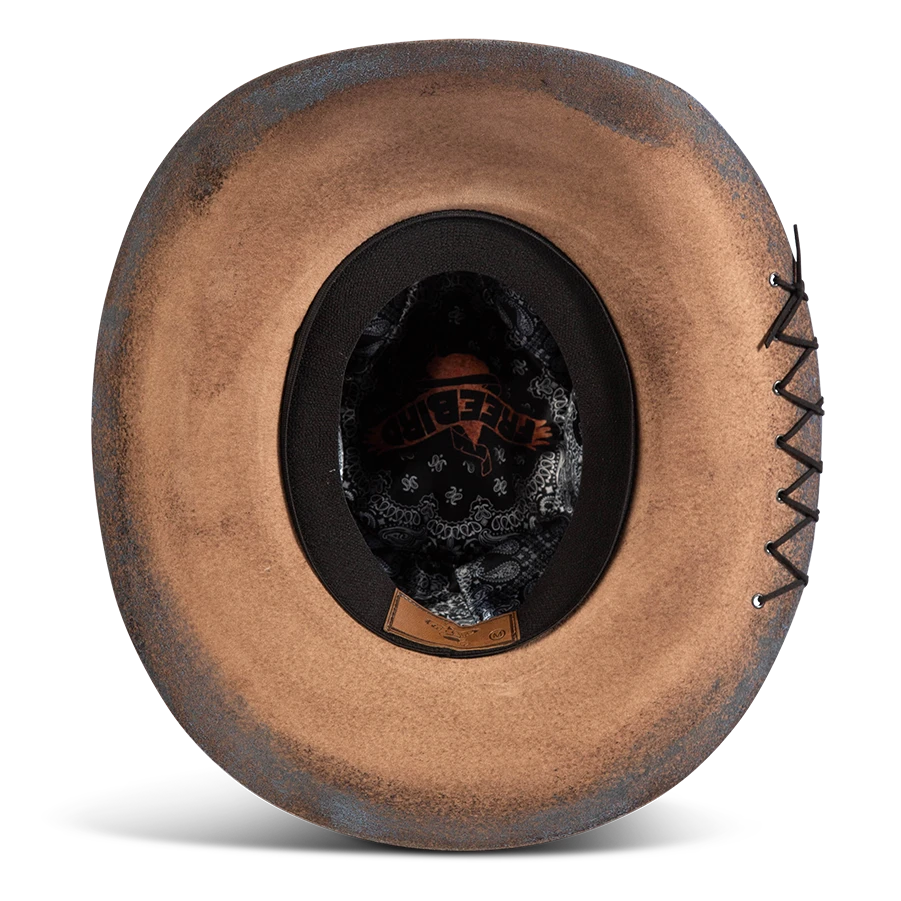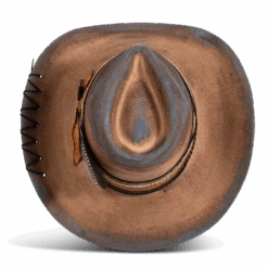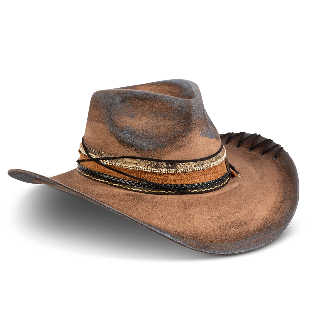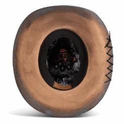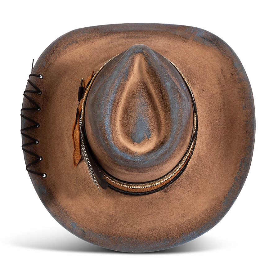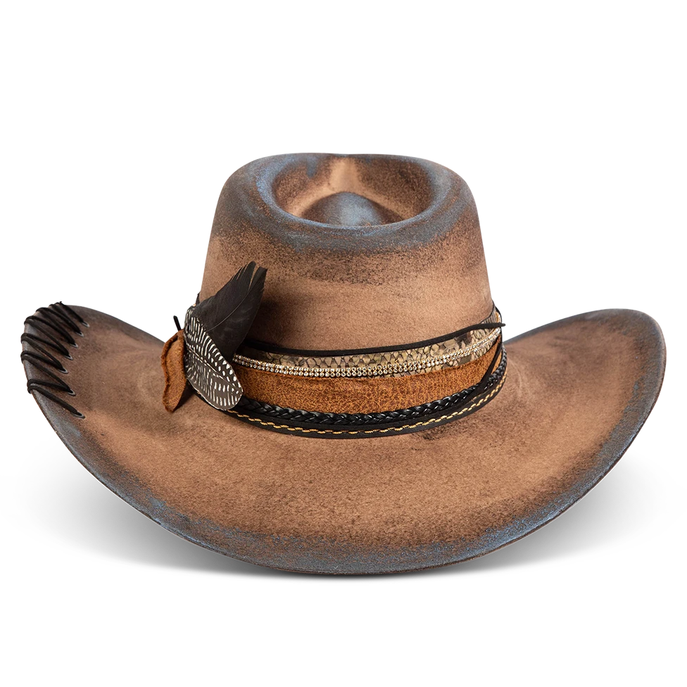 Daring, detailed, and full of attitude – the KIT hat was made for those who lead with edge and confidence. Hand shaped from high quality wool felt, this distinctive hat features a smoky, burnished finish that speaks of adventure.
