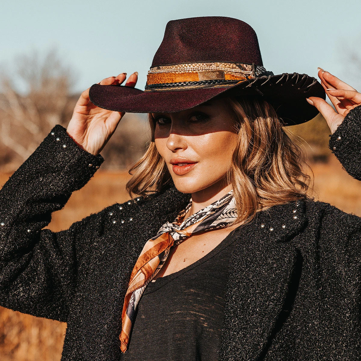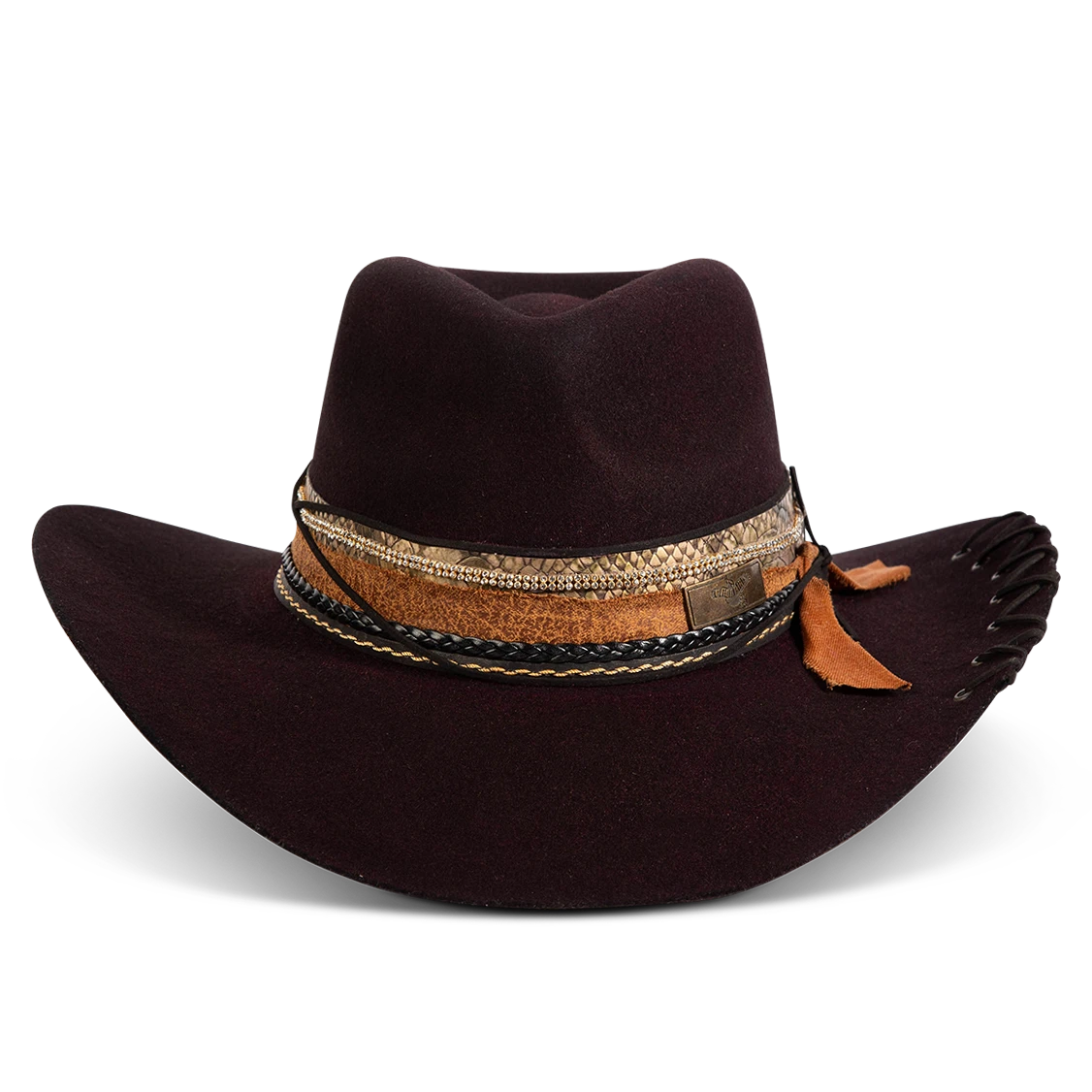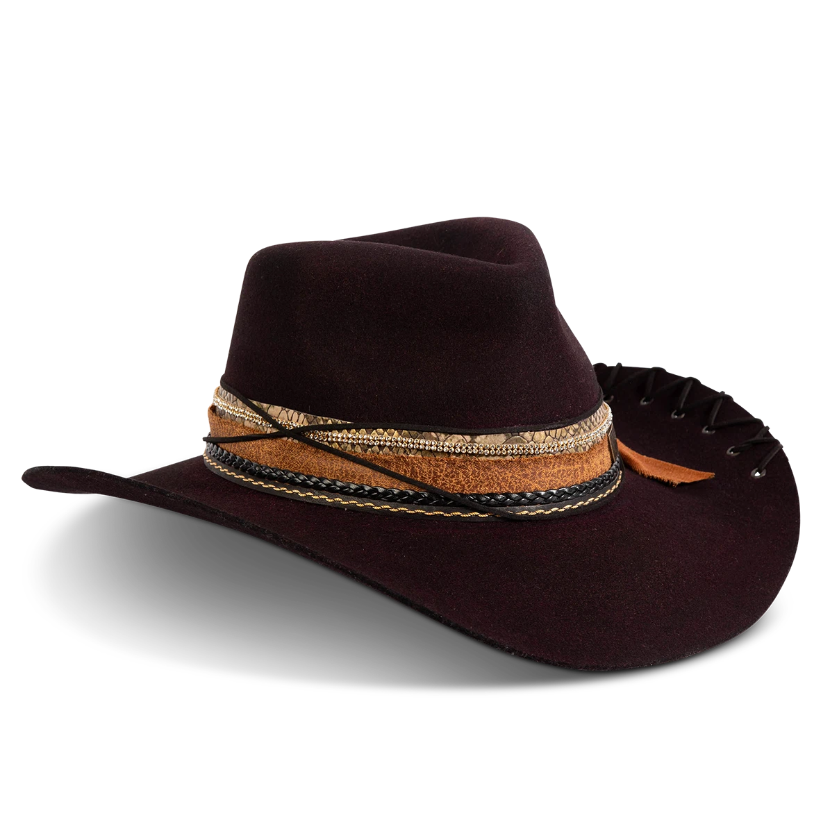 Daring, detailed, and full of attitude – the KIT hat was made for those who lead with edge and confidence. Hand shaped from high quality wool felt, this distinctive hat features a smoky, burnished finish that speaks of adventure.
