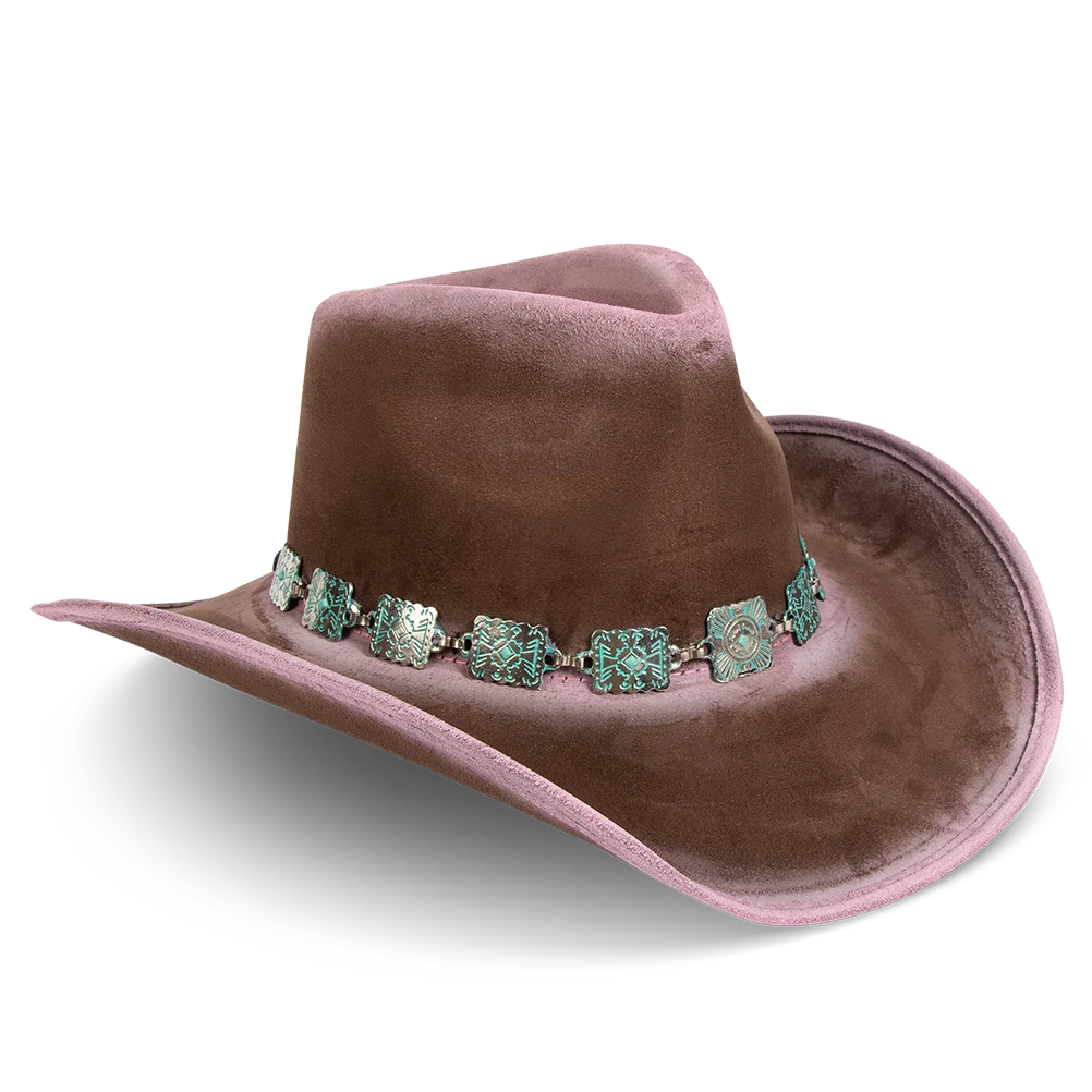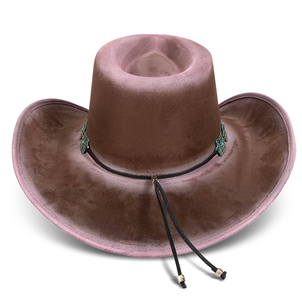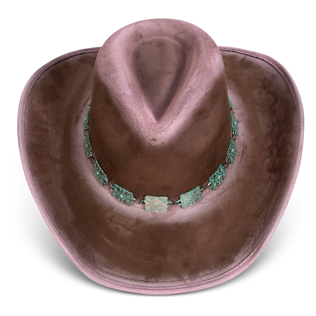 Crafted with a tear-drop crown and an upturned brim, LASSO is a classic western-inspired hat with added texture. Adorned with a turquoise metal engraved band that pops against the neutral hues.