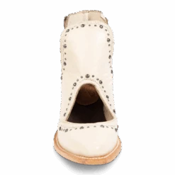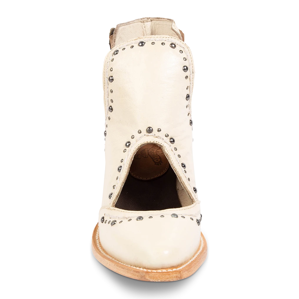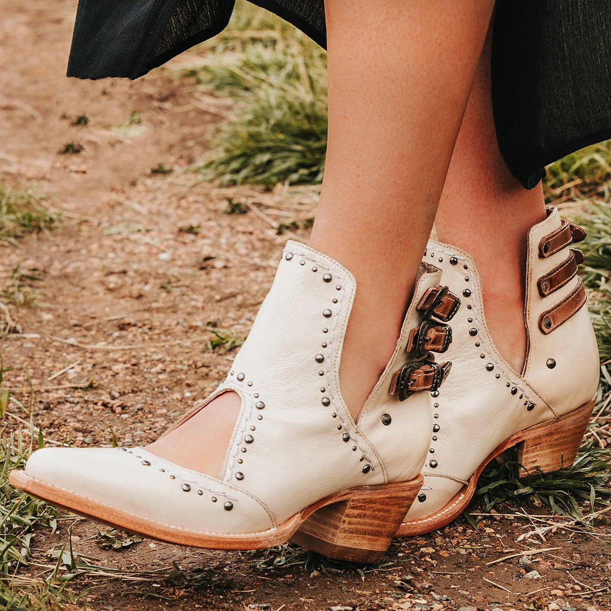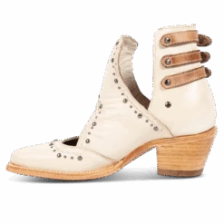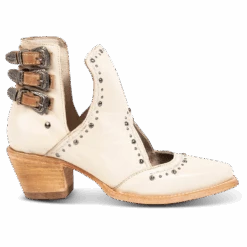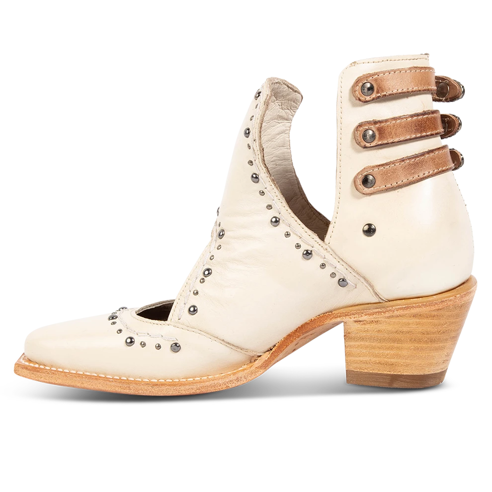 Turn up the volume with MELODY – the bootie that hits all the right notes. Crafted with 100% full-grain leather, this bold cutout design features studded trim detailing and three western-inspired metal buckles at the ankle. A slightly flared stacked heel adds just the right lift, while the deep V-cut sides and open instep bring a fierce, fashion-forward attitude.