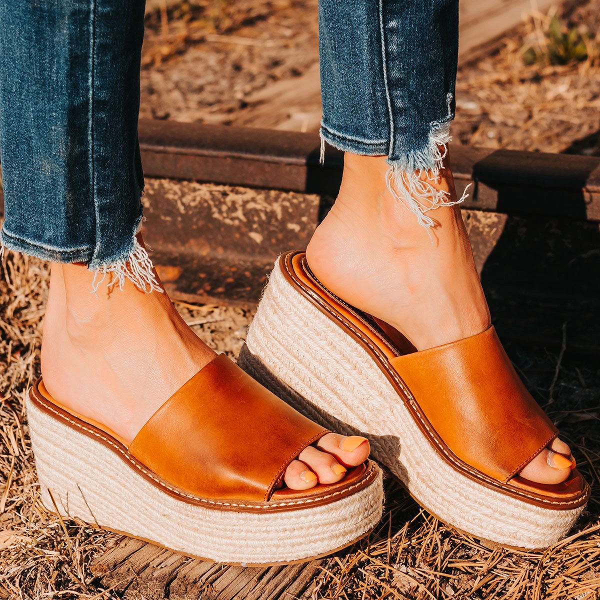 MIAMI – Bringing the heat. This lofty espadrille sandal is completed with a wedge heel and topped with an embossed leather upper.