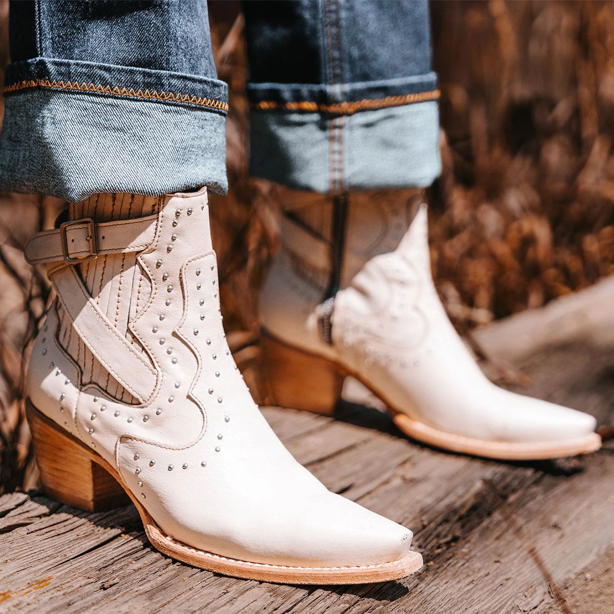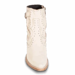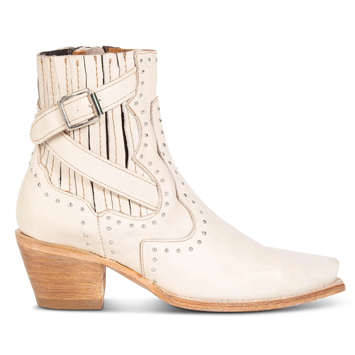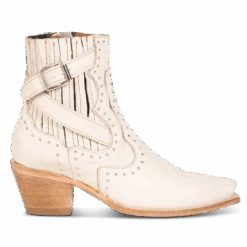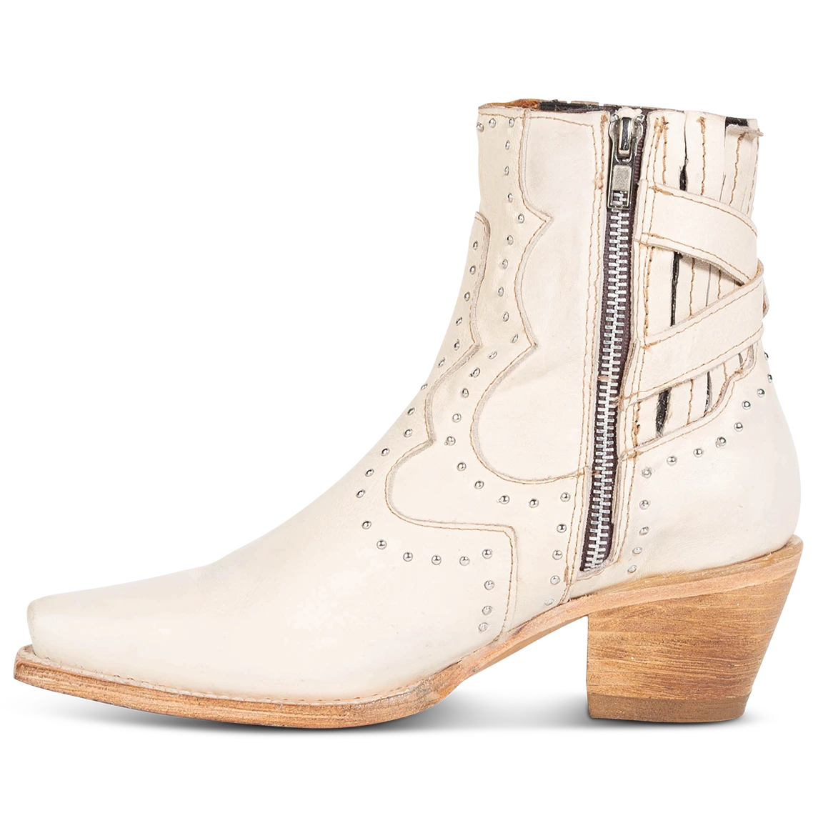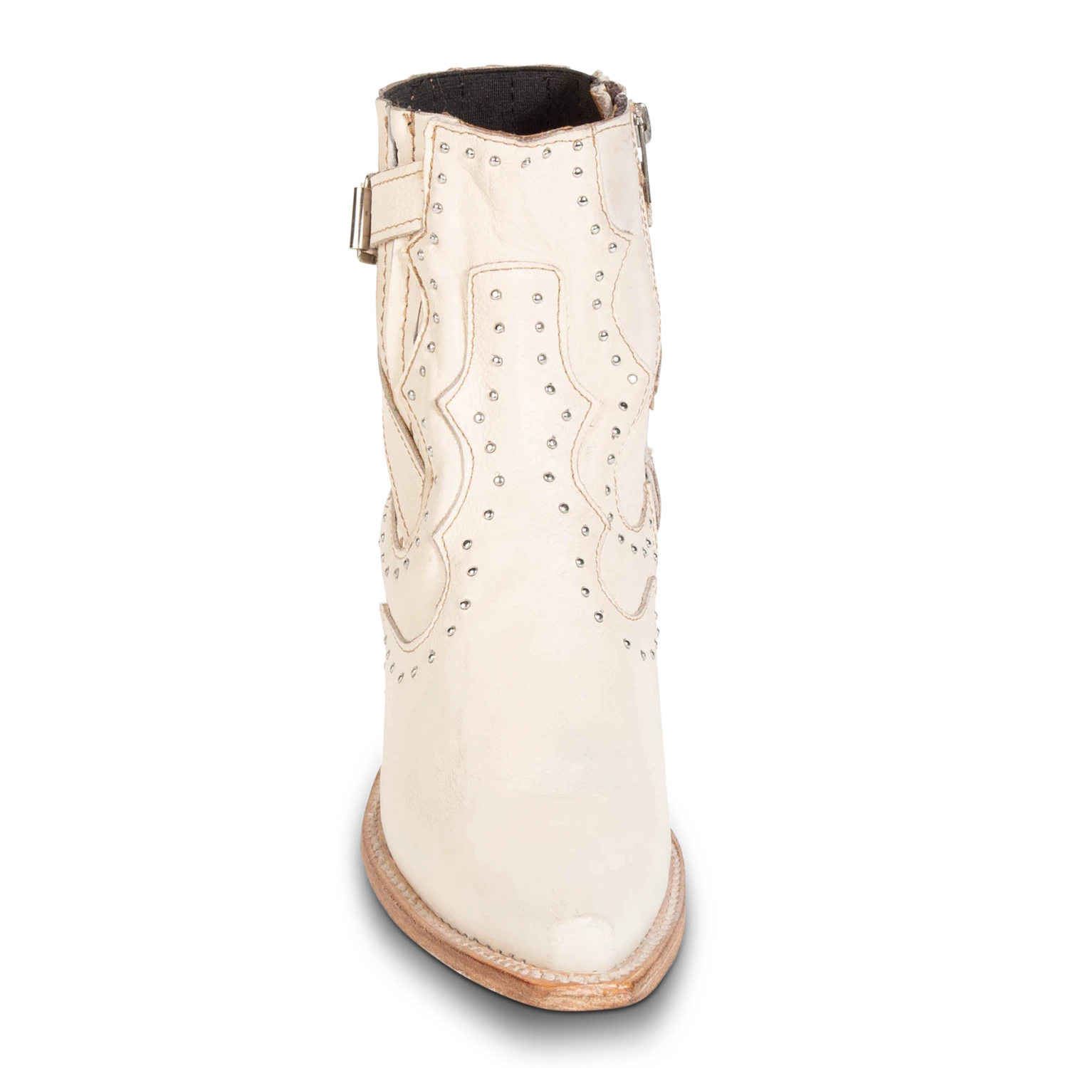 Breaking all the rules – MORGAN. Constructed with 100% full-grain leather, this ankle bootie displays handcrafted detailing at every curve, with its silver studs, criss-crossing heel strap, and classic snip toe. Finished with a working zip closure and gore backing for additional flexibility.