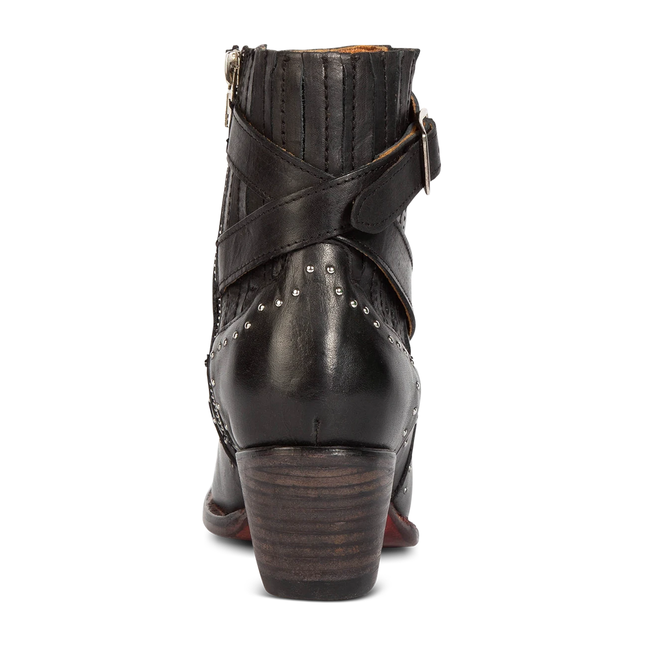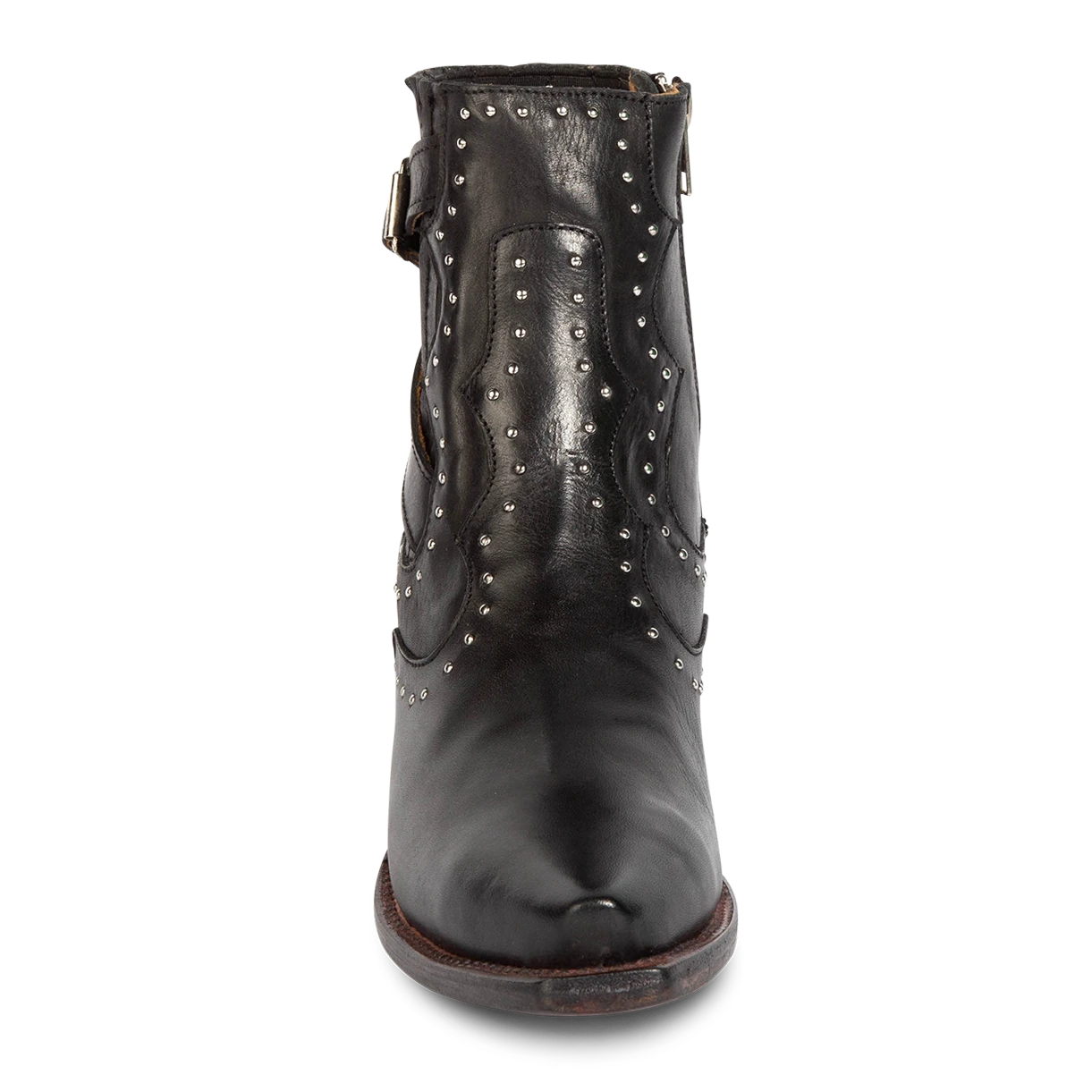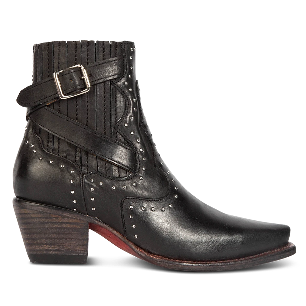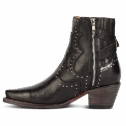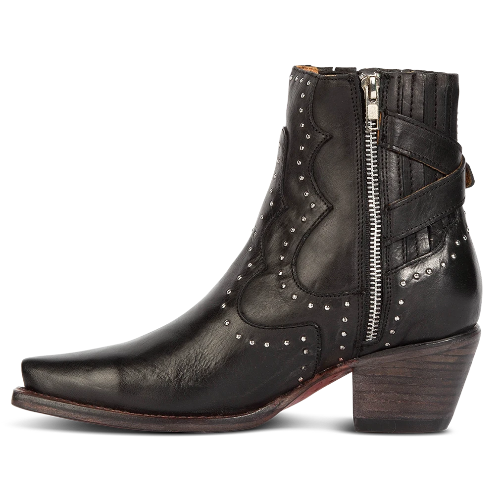 Breaking all the rules – MORGAN. Constructed with 100% full-grain leather, this ankle bootie displays handcrafted detailing at every curve, with its silver studs, criss-crossing heel strap, and classic snip toe. Finished with a working zip closure and gore backing for additional flexibility.