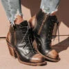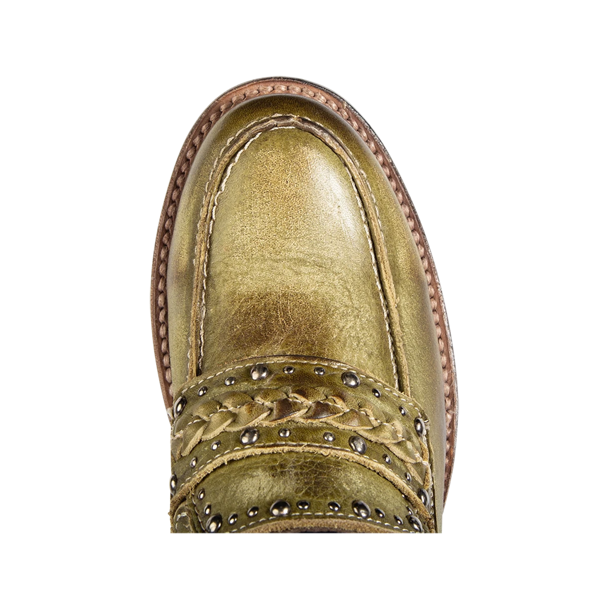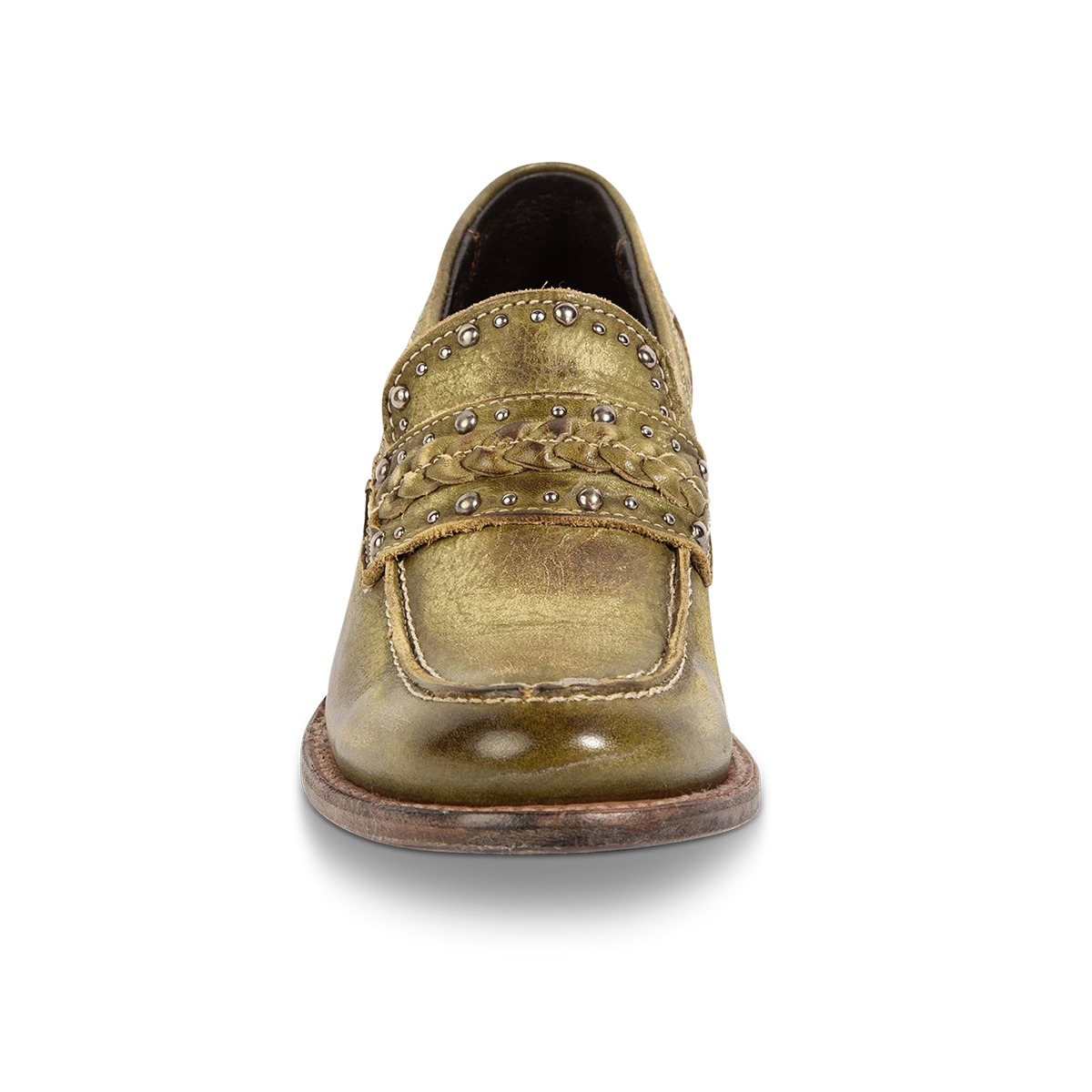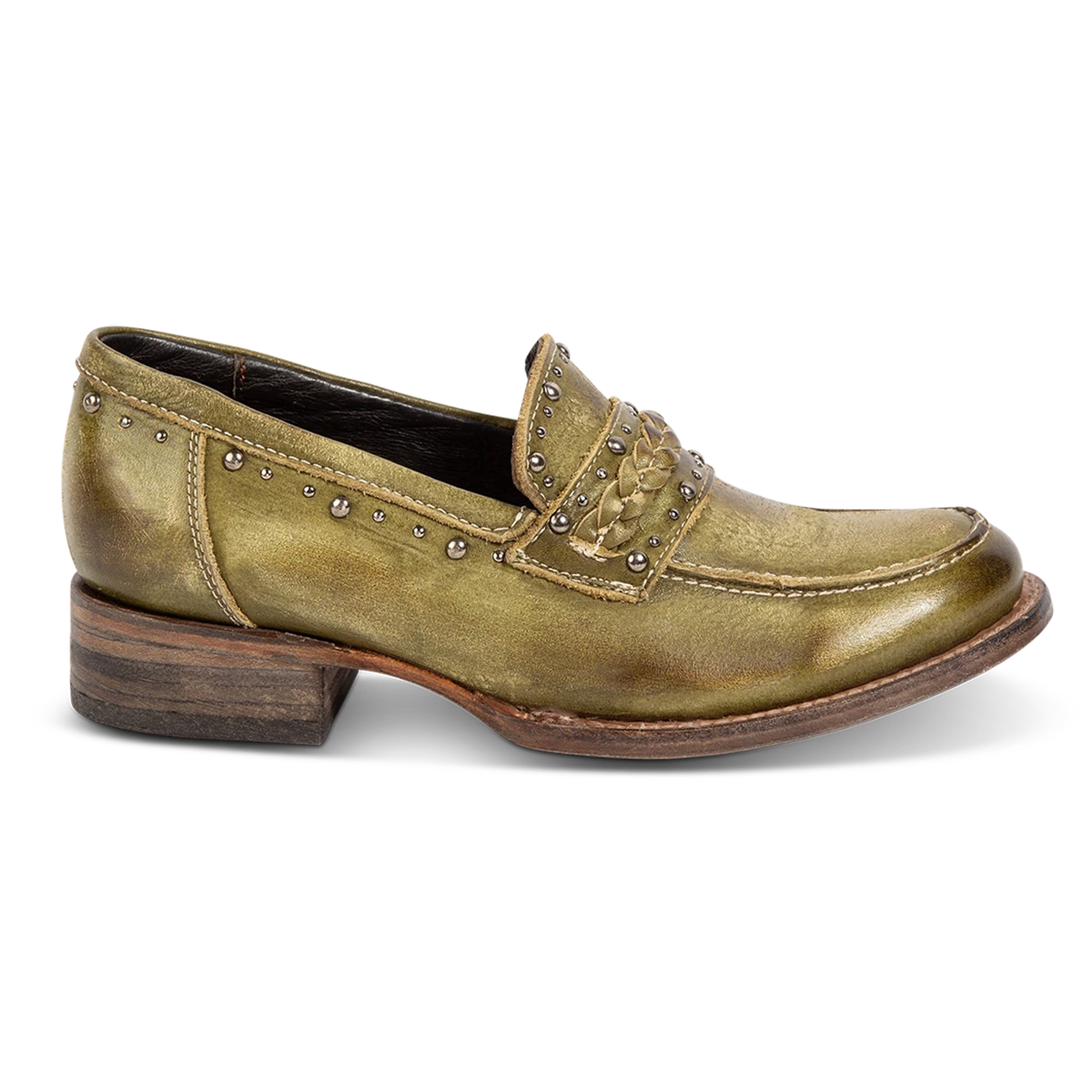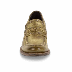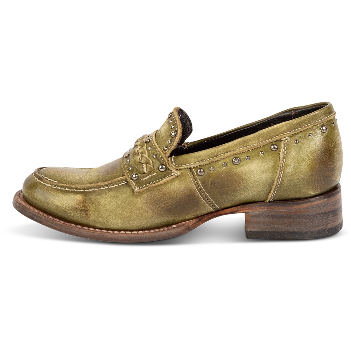 Our modern day loafer with rural roots – meet MYLA. This distinguished oxford silhouette is constructed from 100% full grain leather and subtly adorned with stud detailing and a braided leather band. Finished with a stacked wrap heel and soft leather tongue that provides comfort and flexibility without sacrificing rustic integrity.Â