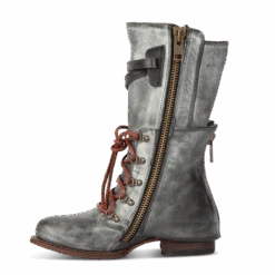 Stay grounded in the RAVI. This unique mid-calf construction features a decorative D-ring lace-up and is connected to a leather overlay with zippers at each heel. With decorative belting and a full inside brass zip closure, you’ll be an effortless trendsetter.