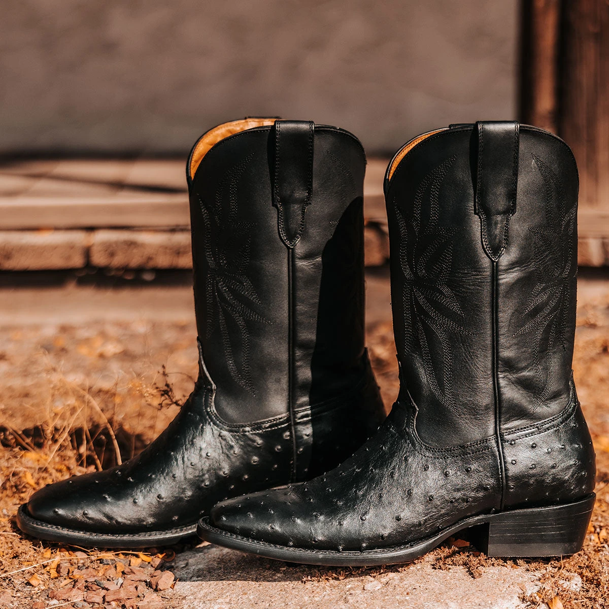 Find strength in UNION. Built with a square toe, this mens boot was crafted with 100% full-grain leather, a good-year welt, and subtle decorative stitching. Finished with functional pull straps and leather sole. Designed with genuine ostrich leather.