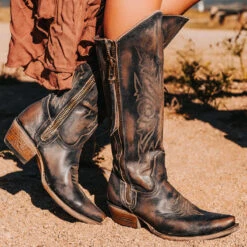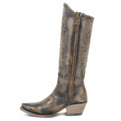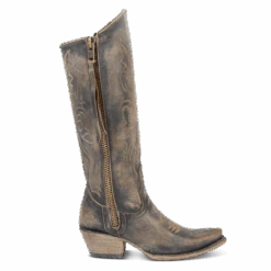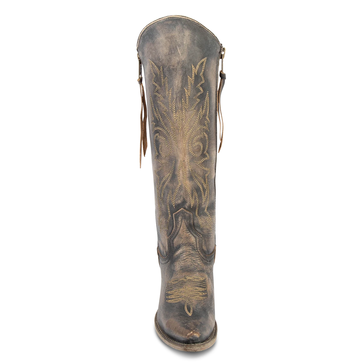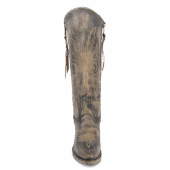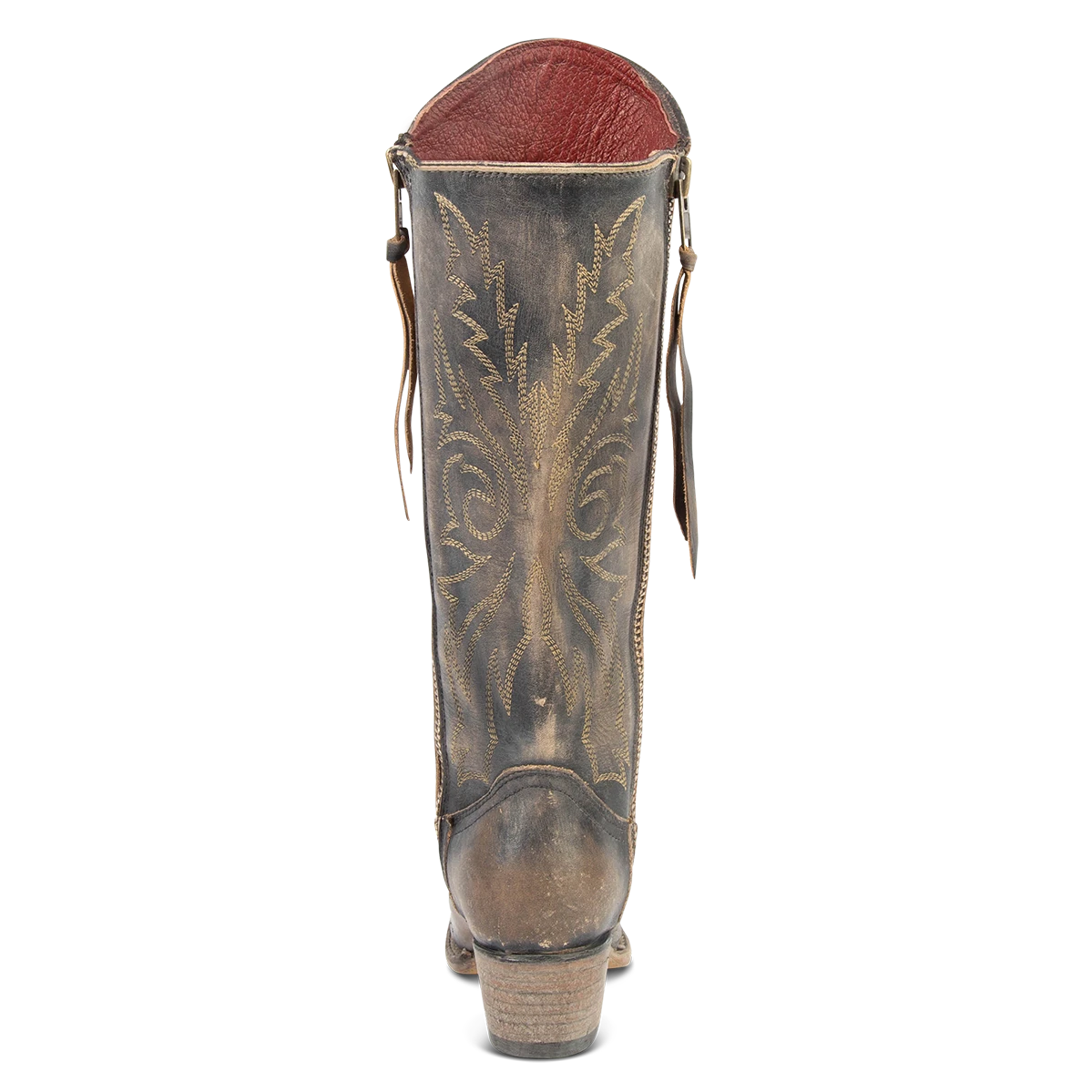 Western-inspired characteristics are found throughout this snip toe and decorative stitching knee-high boot. WOLFGANG is carefully taken through a rock-tumbling process to add a distinct distressed and vintage look. Designed with dual zip closures and accented with removable tassels.Â