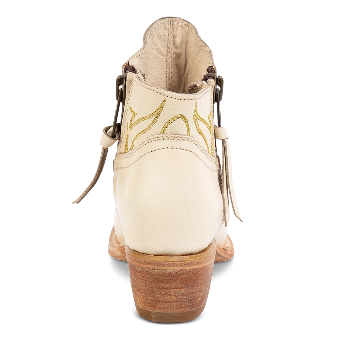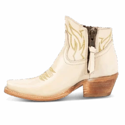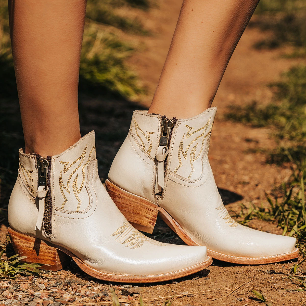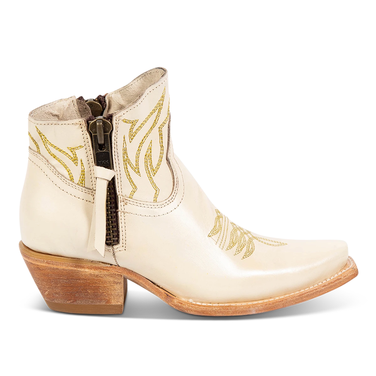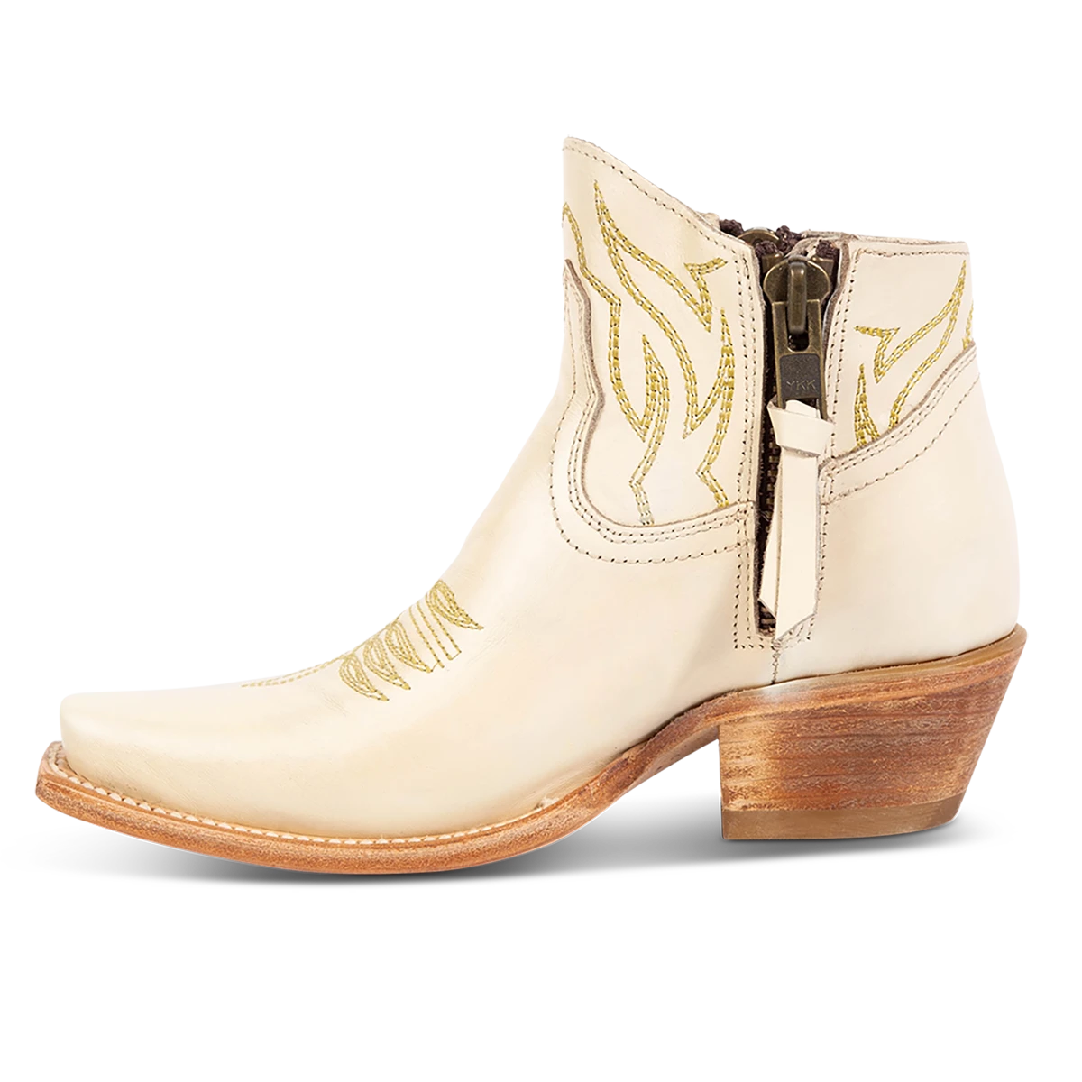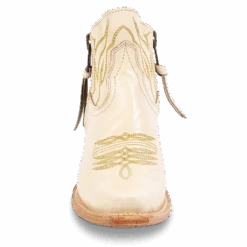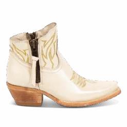 Wow them in WOLFIE. Inspired by a western silhouette, this distressed bootie features snip toe construction, intricate stitch detailing, a low slanted heel and symmetrical brass zip closures. Completed with a rock tumbling finish for a distressed look.