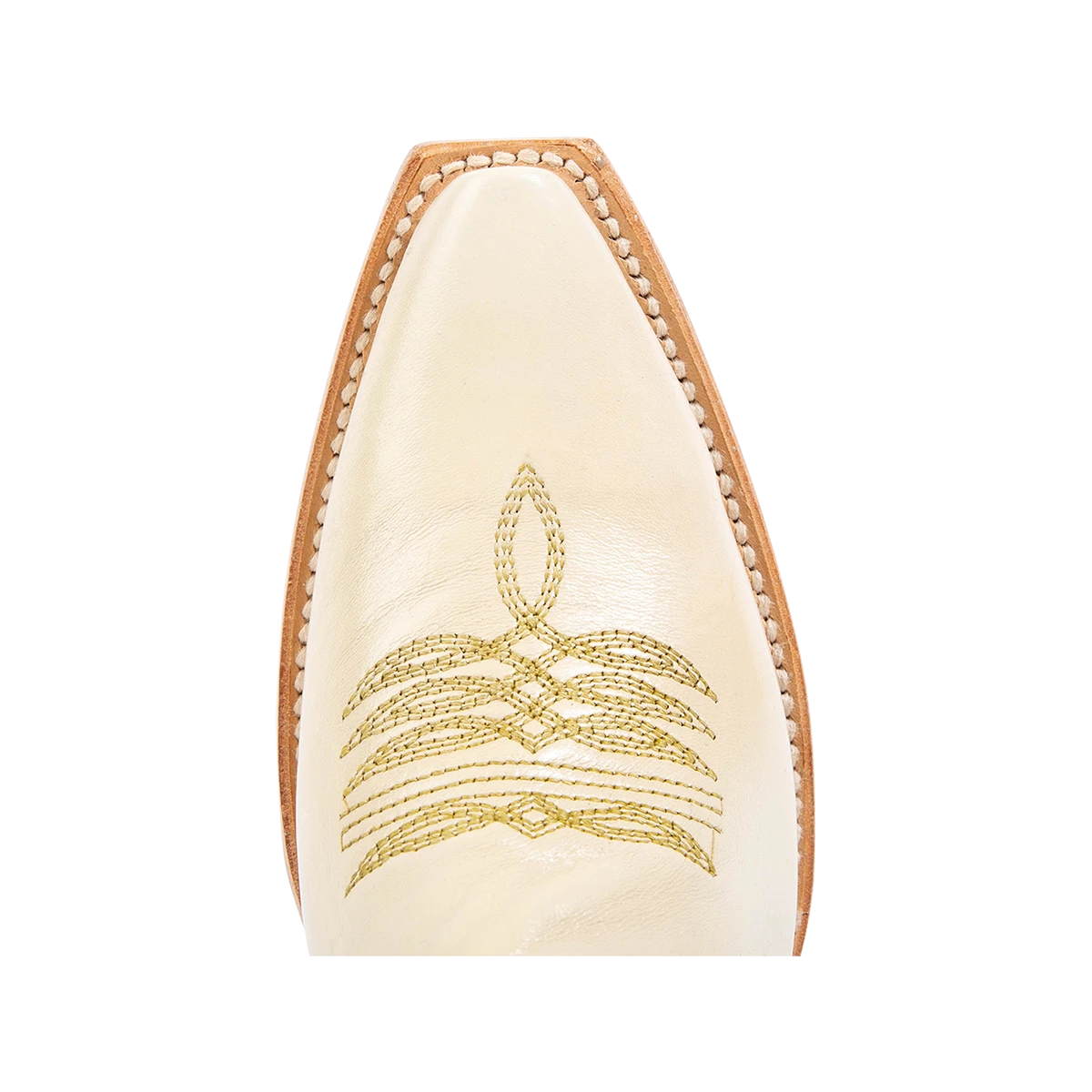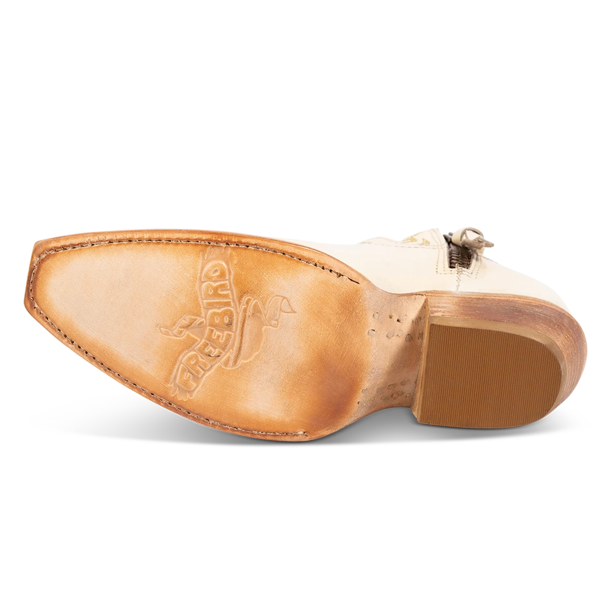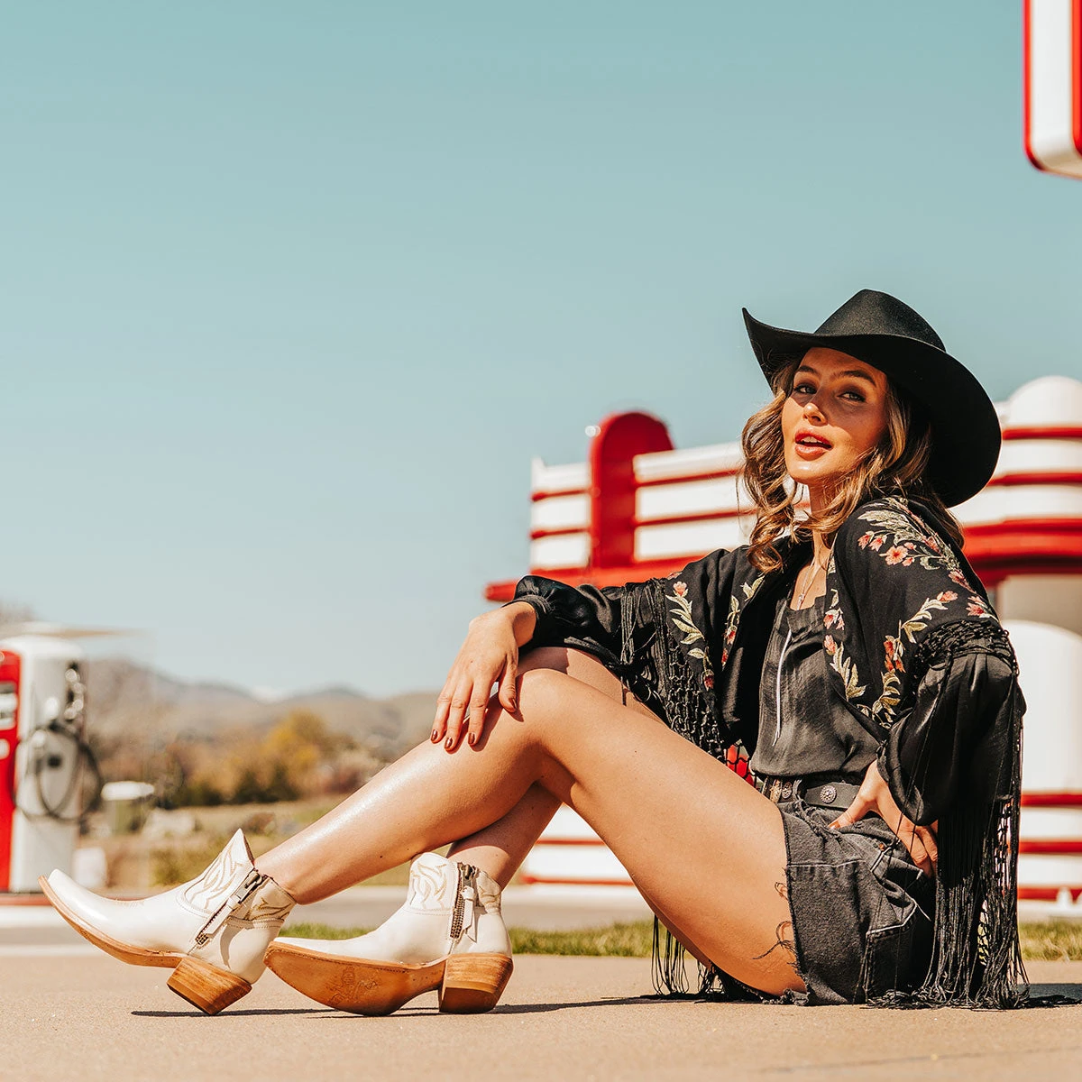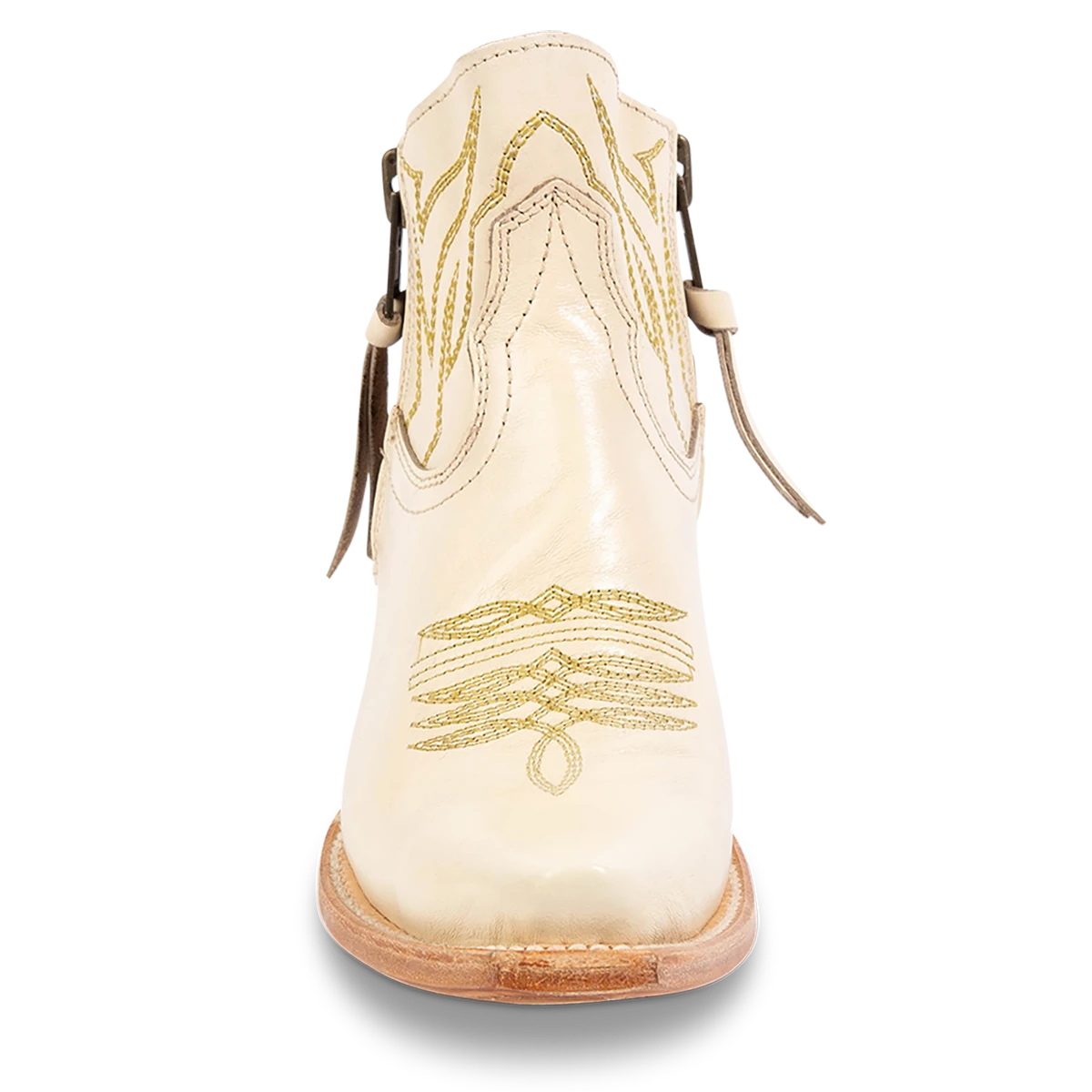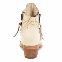 Wow them in WOLFIE. Inspired by a western silhouette, this distressed bootie features snip toe construction, intricate stitch detailing, a low slanted heel and symmetrical brass zip closures. Completed with a rock tumbling finish for a distressed look.