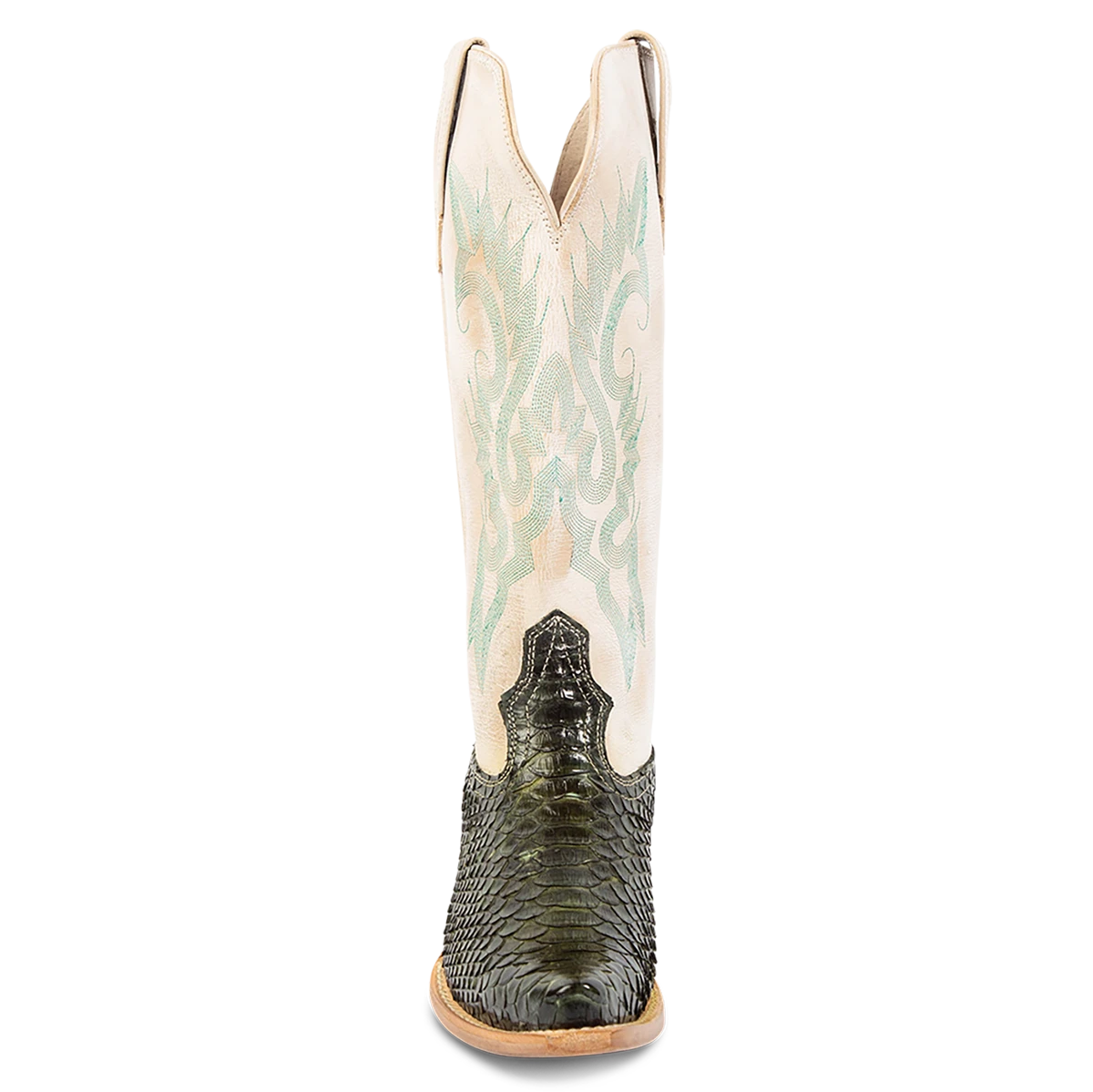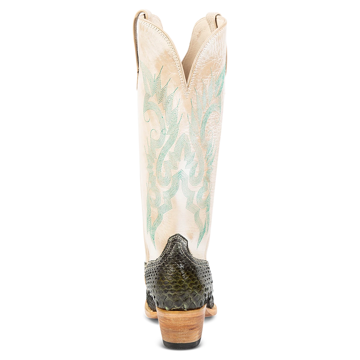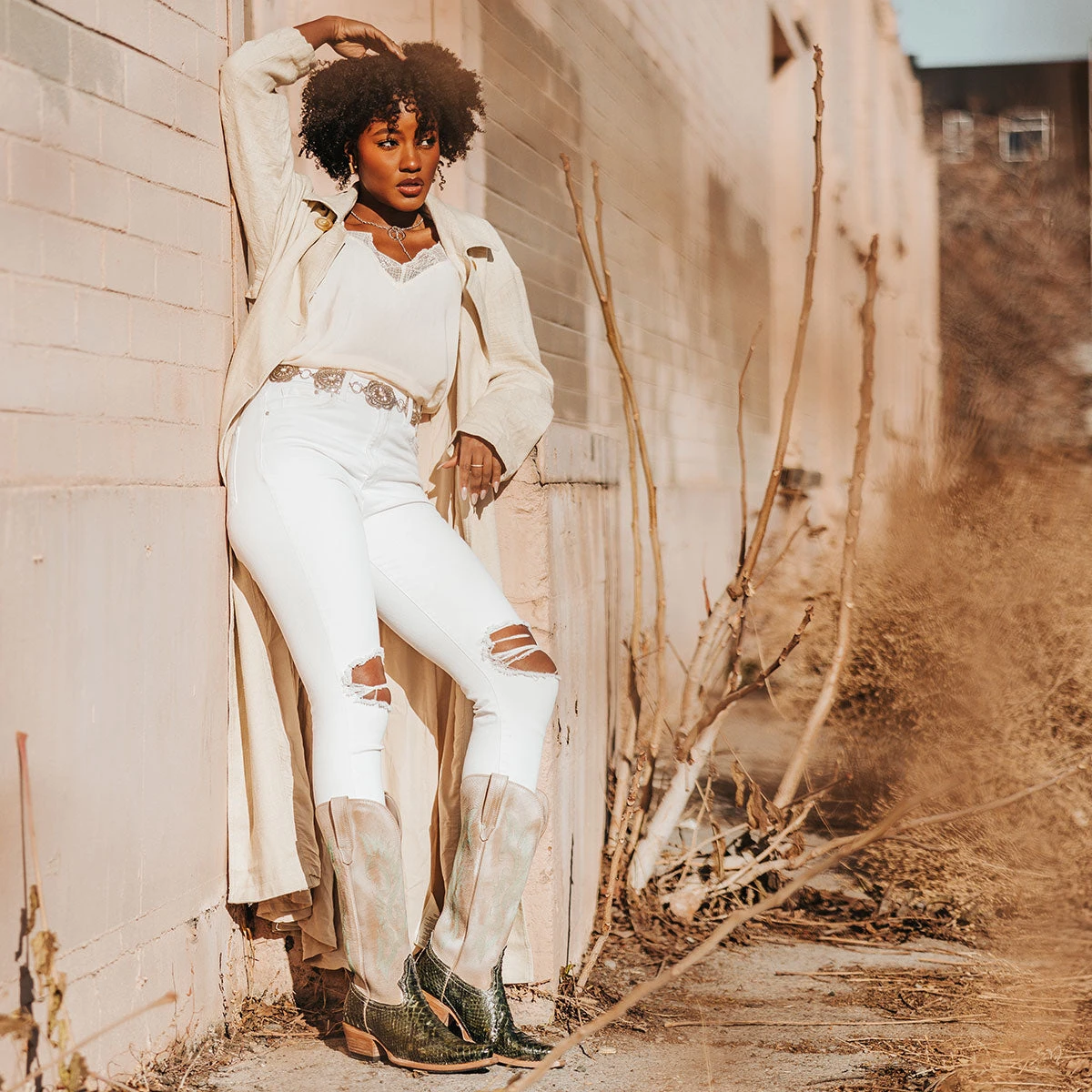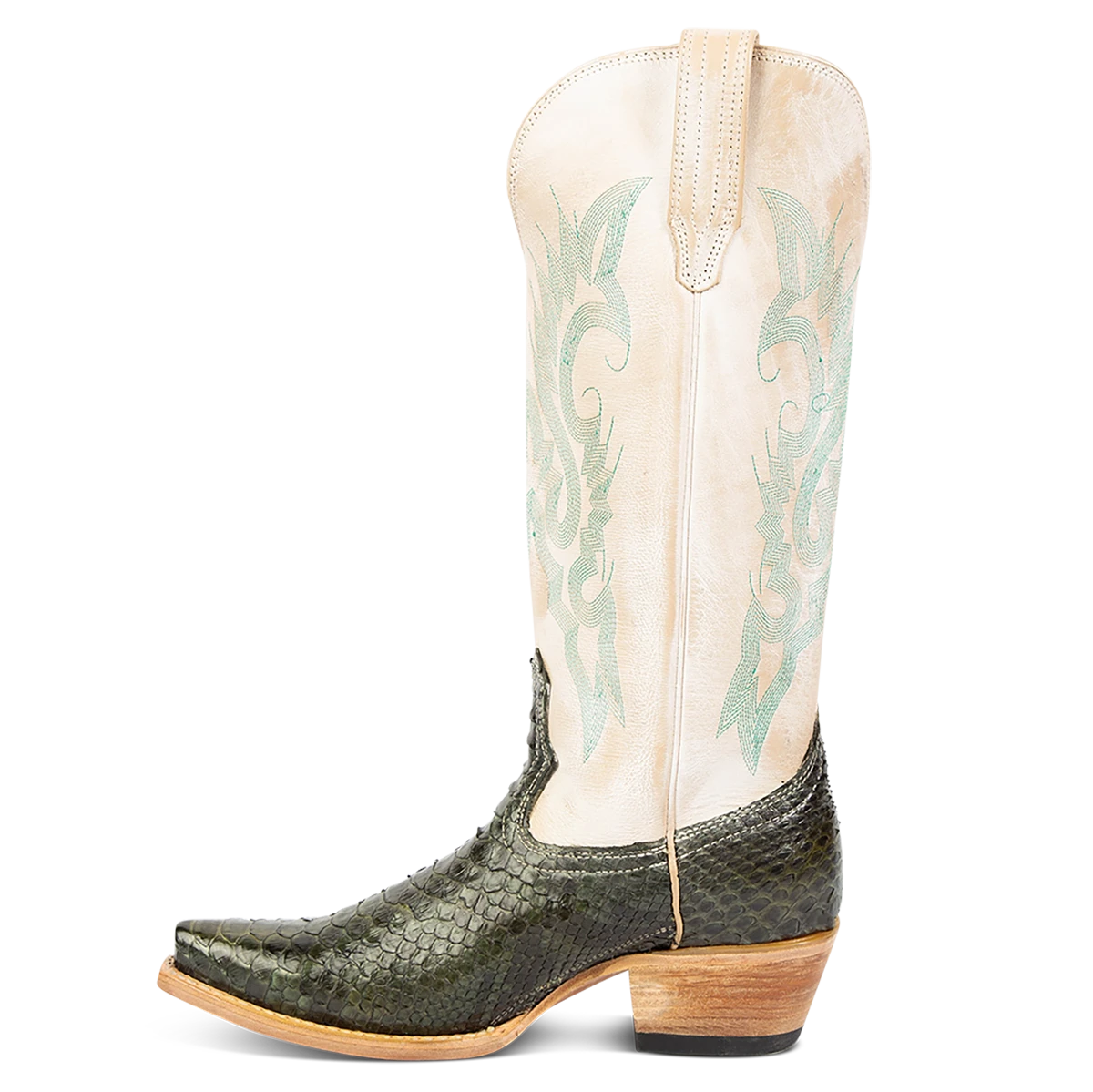 WOODLAND – an outlaw of the Wild West. This Most Wanted boot is the perfect ally with a western silhouette and traditional snip. Fashioned with decorative stitching and leather pull straps, this low heeled boot is ready for any contest. Designed with geniune python leather.